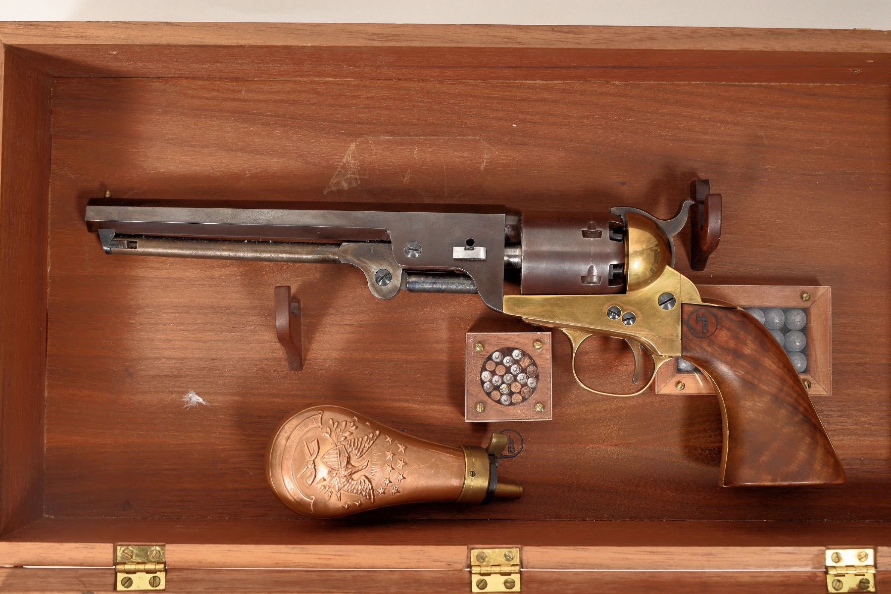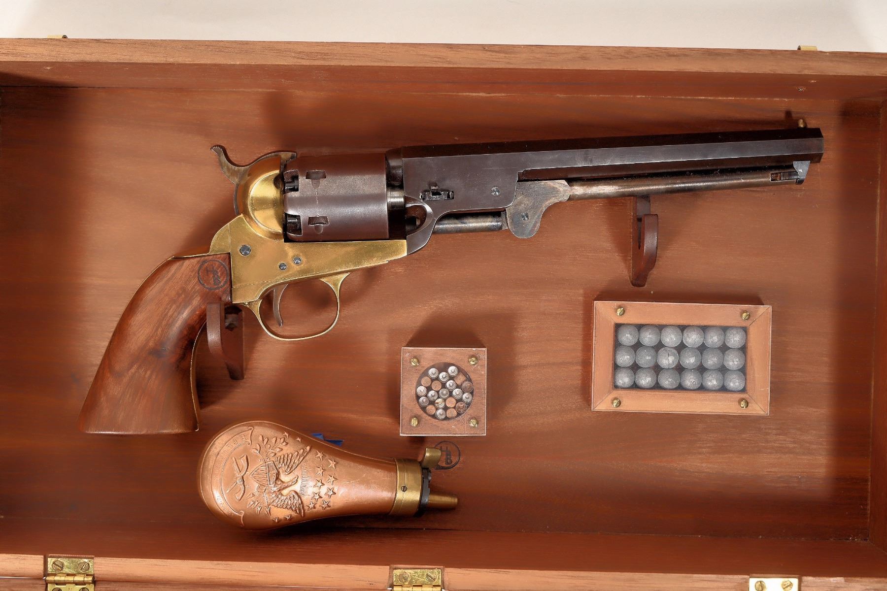 This shadow-box includes an 1851 Navy Colt replica. There is no serial number on the firearm and there is a brand mark on the grips "HP". It is nicely finished in brass, walnut and a plum colored bluing. The pistol is in non-firing condition. There are .36 cal. round balls, percussion caps and a pistol powder flask included in a walnut display box at 16.5 in. X 8.5 in. X 3.5 in. No FFL required. Please see photos for details.