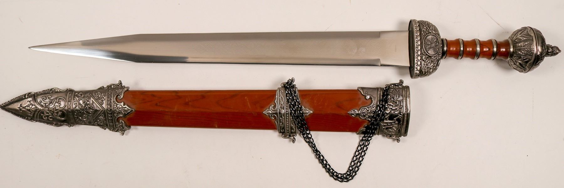 30" double edge sword stamped China stainless, plastic sheath with English hound and battle scene