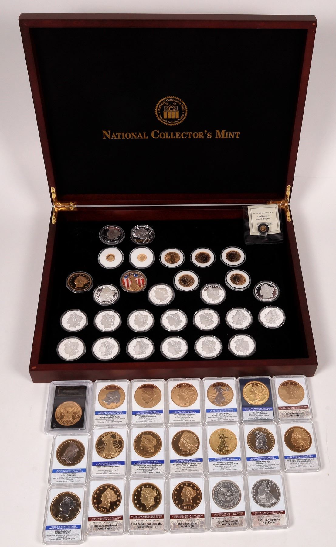 A collection of "COPY" coins, made by various mints in tribute to numismatic rarities. Wooden case from the National Collector's Mint with 17 frosted proof Morgan dollars; two Peace dollars. 1849 $20 gold piece; 1933 St. Gaudens $20; five 1929 Indian Head $10 gold; Nineteen American Mint rarity replicas in plastic slabs; one Bradford Exchange Mint $50 Humbert U. S. Assay Office ".887" also slabbed.