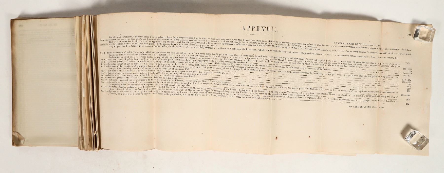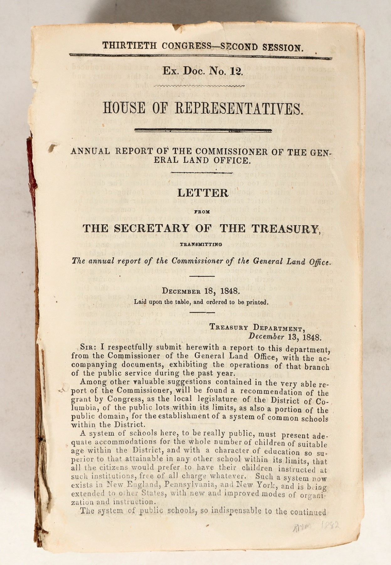 Report by Commissioner of General Land Office. Dec. 18, 1848. This report is very early in the workings of the GLO. The text clearly states that the Govt does not want land surveyed unless necessary. They also had severe problems employing qualified people to conduct surveys, a problem that persisted through the 1850s. The maps have been removed and placed into specific sate suites to allow for specific state survey study through time, since these reports are, in essence, about the "westward movement." 191pp plus appendices.