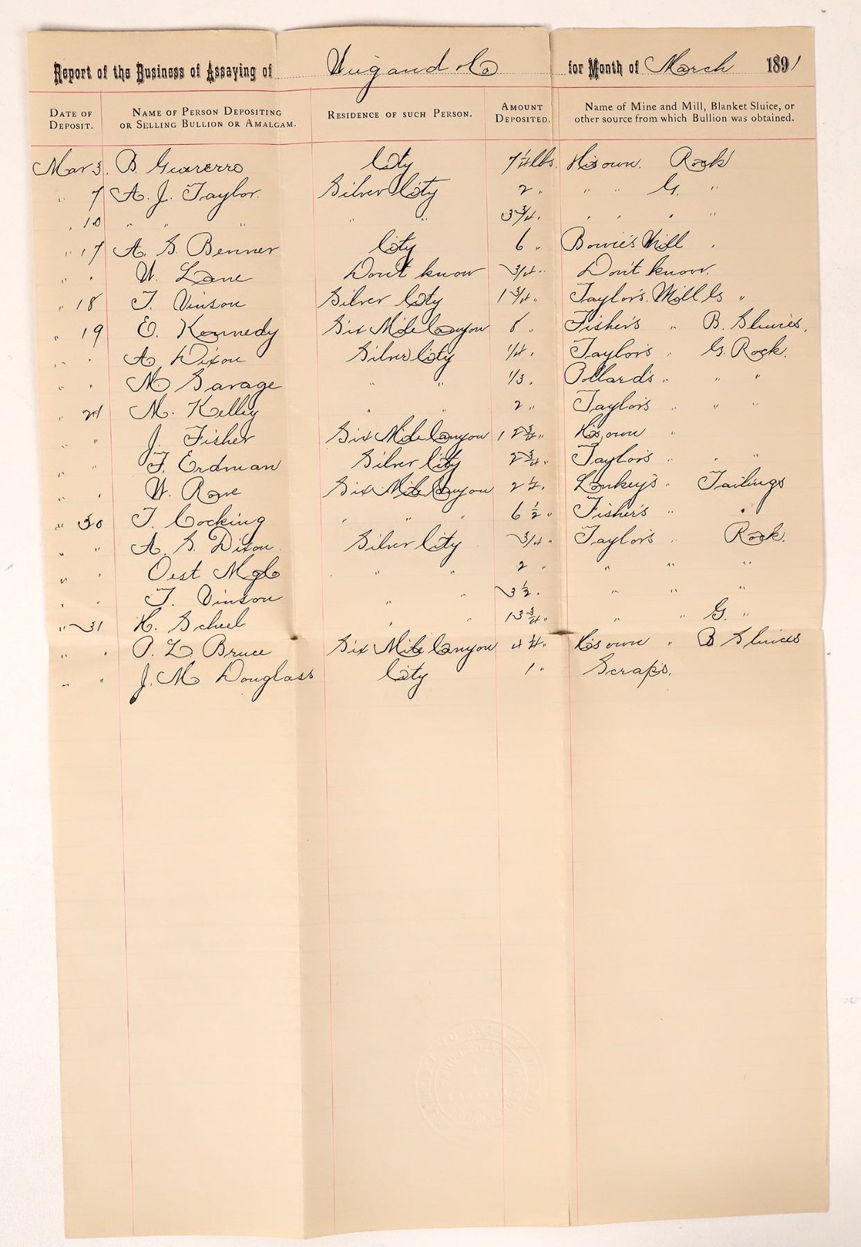 Rare! Storey County Report of Assaying Business filed by Samuel Dowling as owner of the assay business Wiegand's Assay Office for the month of March 1891. 20 entries. Lists Name of Person Depositing or Selling Bullion, Residence of Such Person, Amount Deposited, and Name of Mine and Mill, Blanket Sluice or other source from which Bullion was obtained. Includes samples from sluices, mining rock, and tailings. Mills include: Taylor's, Bowie's, Lonkey's, and Fisher's. Most of the residences are listed as Silver City or Six Mile Canyon. 17" x 11" Folds, some separation, and toning. Signed by Dowling on reverse. Sam Dowling was a long-term assayer on the Comstock. In 1865, he was working at the Ogden Mill at the bottom of the hill below Virginia City. It was owned independently by San Francisco banker W. C. Ralston, who incorporated it. Born in Maine about 1832, Dowling worked for several mines before settling is as the key assistant to an aging Conrad Wiegand. Dowling took over or bought Wiegand's business shortly after Wiegand died in 1880. He continued the Gold Hill Assay Office for a short time, perhaps just a year, getting contracts with several mining companies free of the politics that bogged down Wiegand. Dowling sold out to Chris James late in 1880, who handed the business off to W. S. James within a few years. Dowling continued as an assayer for various mining companies, though he no longer ran his own company.