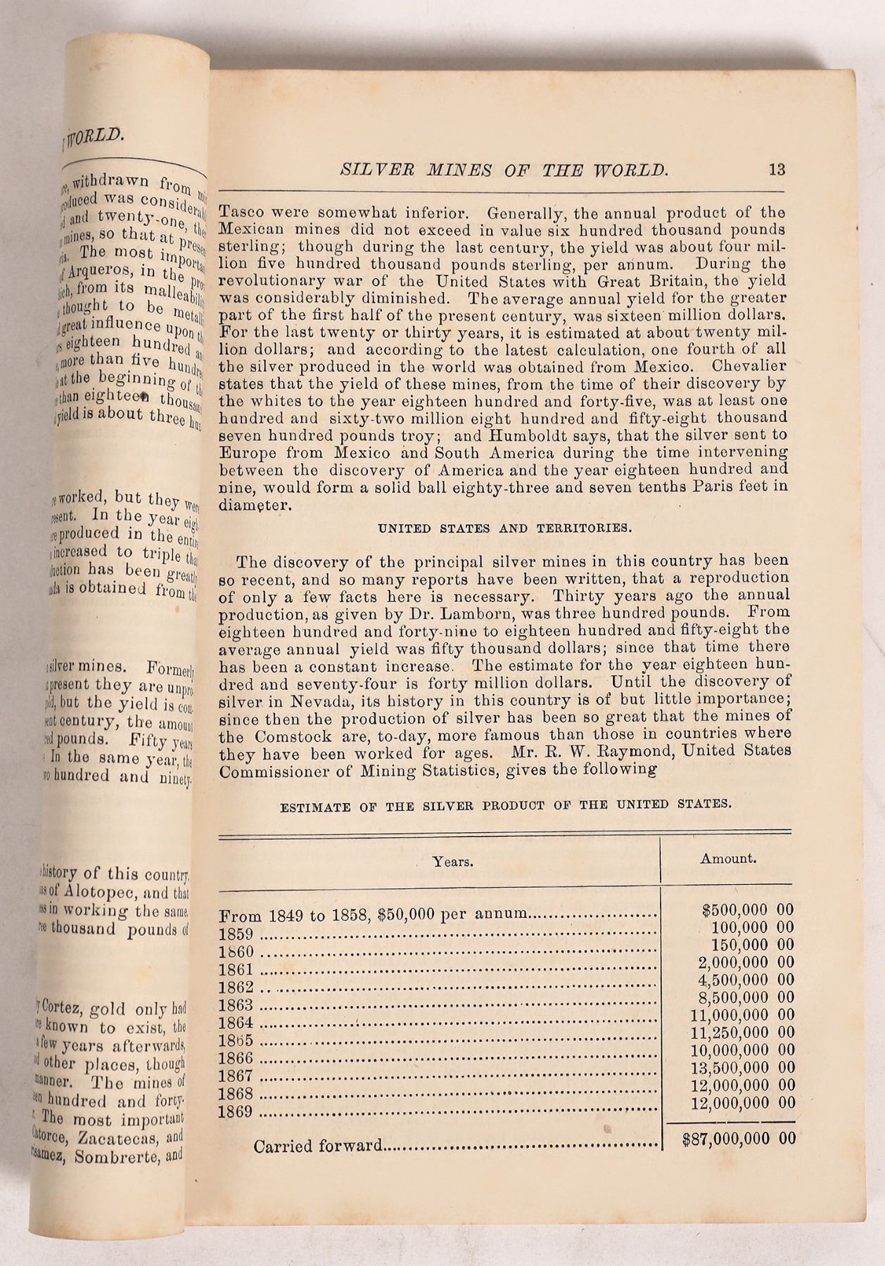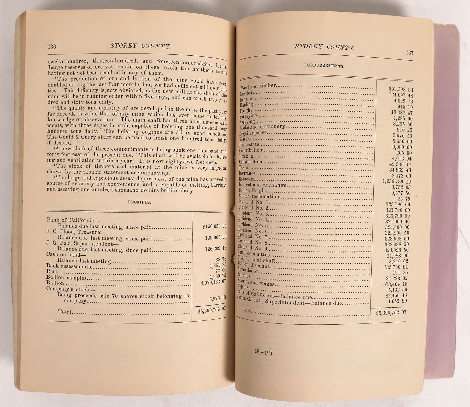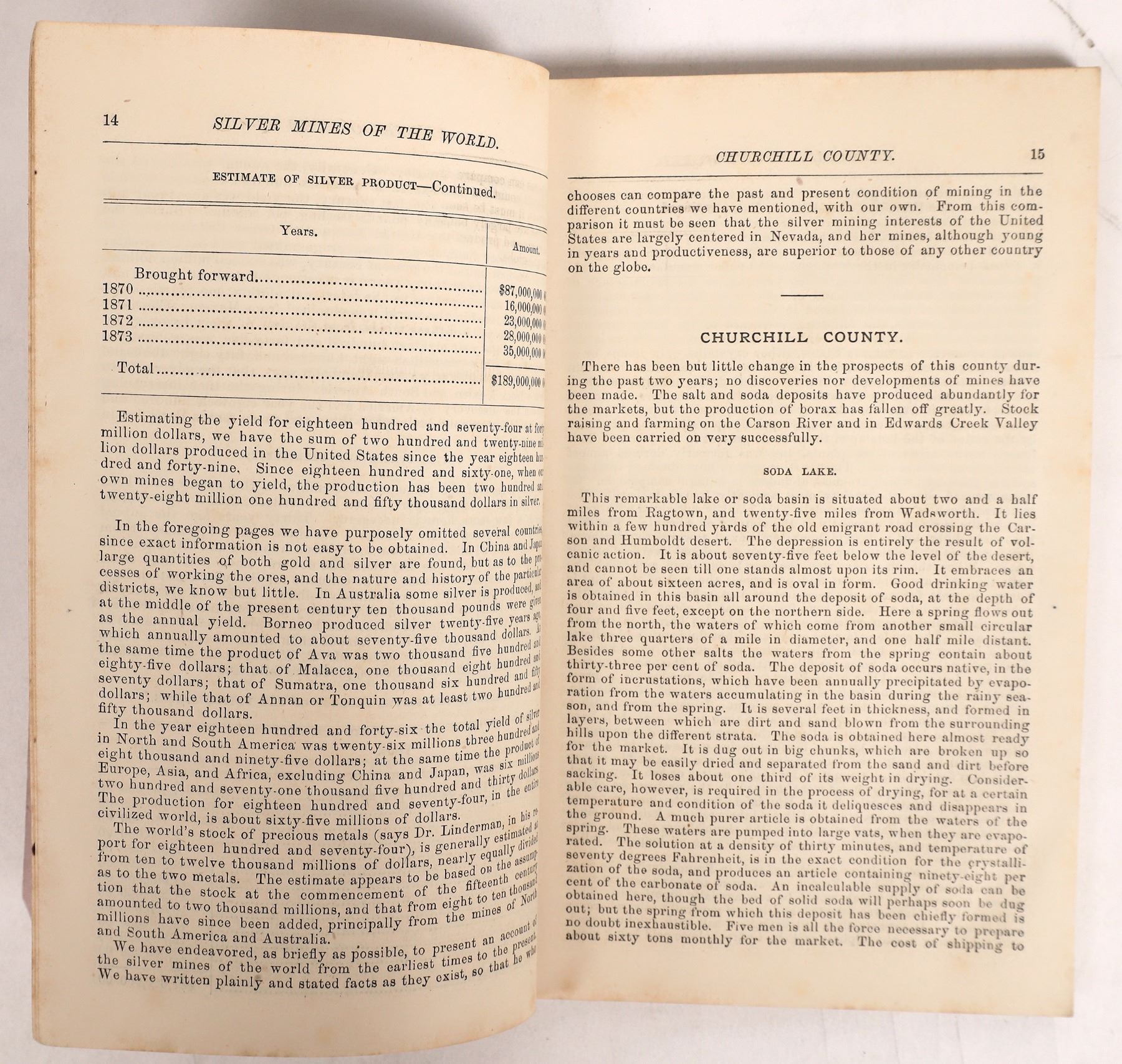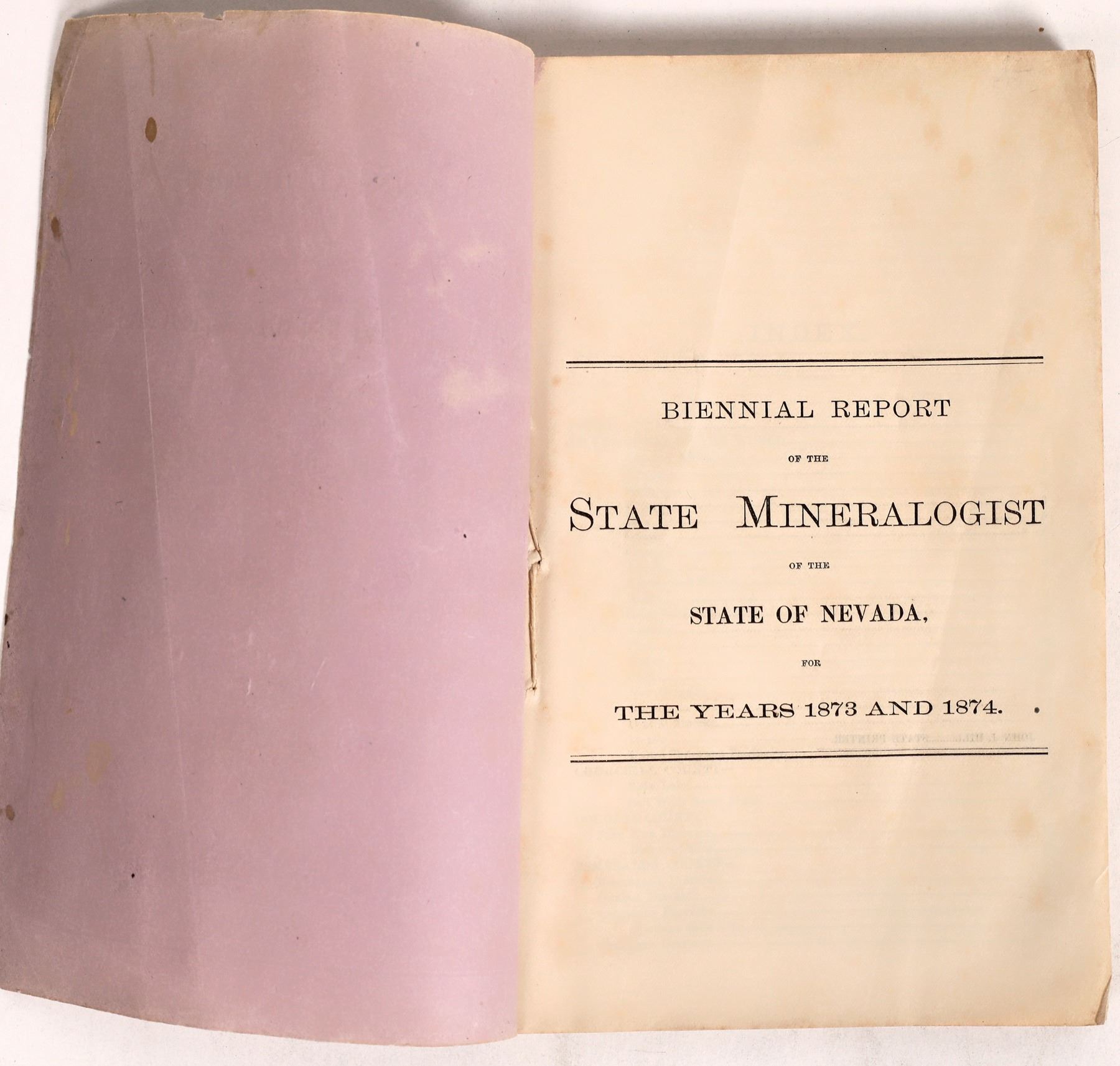 Carson City: John J. Hill, State Printer, SPO, 1875. First edition, limited to 3000 copies of which 500 were bound in cloth. 8 7/8 x 5 3/4. 191 pages. This copy is in original mauve printed wraps. Nevada Imprints 195; Armstrong, Nevada Printing History 807. Not in Paher's Nevada Bibliography. Henry R. Whitehill was the state mineralogist. Early report referencing Nevada mining including a wealth of valuable data regarding all the mines. The report starts out with a brief review of Silver Mines of the world. After a brief report on all the counties with some more detail on Nye County (the Philadelphia and the Jefferson Canon Districts) a great deal (55 pgs.) is devoted to Storey County and the Comstock Lode including discussion of "The Big Bonanza" shortly after its discovery. Much detail on the Crown Point, Belcher, Chollar-Potosi and especially on the Consolidated Virginia mine operations. The first analysis of the extent of the Big Bonanza is detailed along with estimations of the adjacent California mine where assays ranged from an average of $1200 to a high of over $8000 per ton. Included is a 50-page supplement, "Showing Proceeds of Mines during the years 1871, 72, 73 and the first three quarters of 1874" with data for many hundreds of mines in tons and value produced for each per quarter. Front cover has slight staining, some soiling and chipping, but overall, very good.