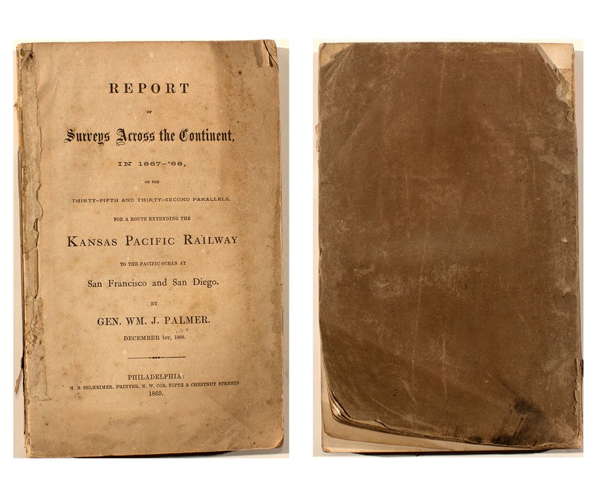 By General William J. Palmer. The railroad wanted to expand to San Francisco and San Diego. 250 pages, Map has been torn out. Covers missing., Very Scarce.