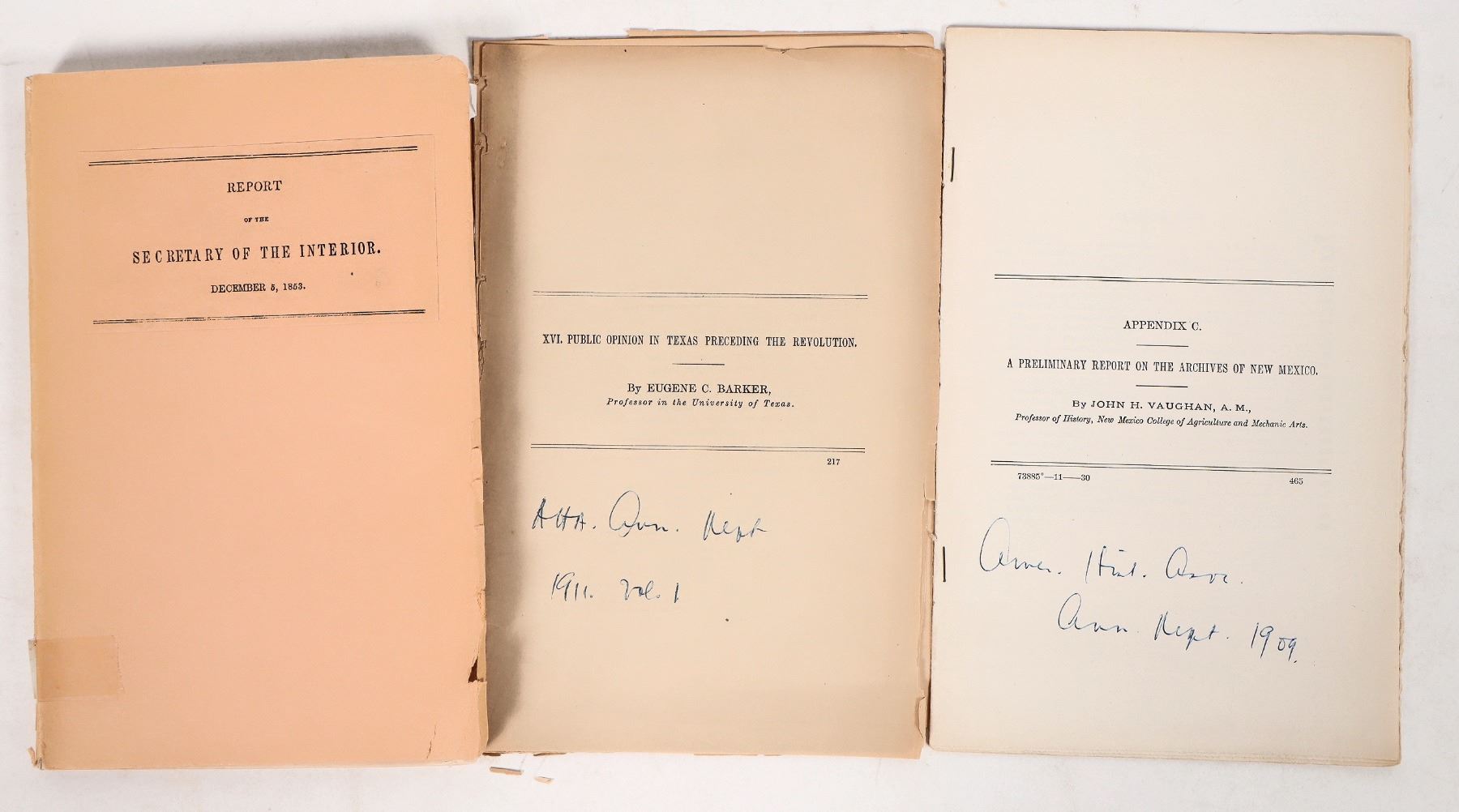 This lot holds the Report of the Secretary of the Interior dated December 5, 1853. The report deals with the West including California, New Mexico, and Texas. An interesting read when trying to encourage western expansion but not clear about dealing with civilized Indians already established in these locations. Over 200 pages detailing the newly acquired lands.