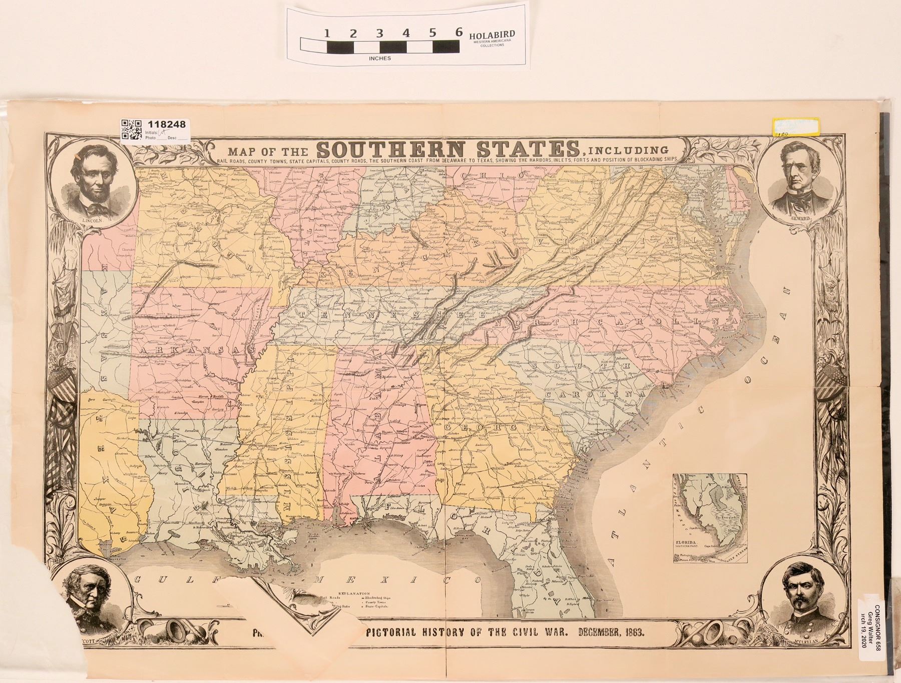 This is a reprint of a 32"x 22" map of the southern states from Harper's. Because it also features drawings of Lincoln, Seward, McClellan and Winfield Scott, it's obviously from the Northern point of view. There is damage( a ripped corner) and a fold rip that is barely visible.