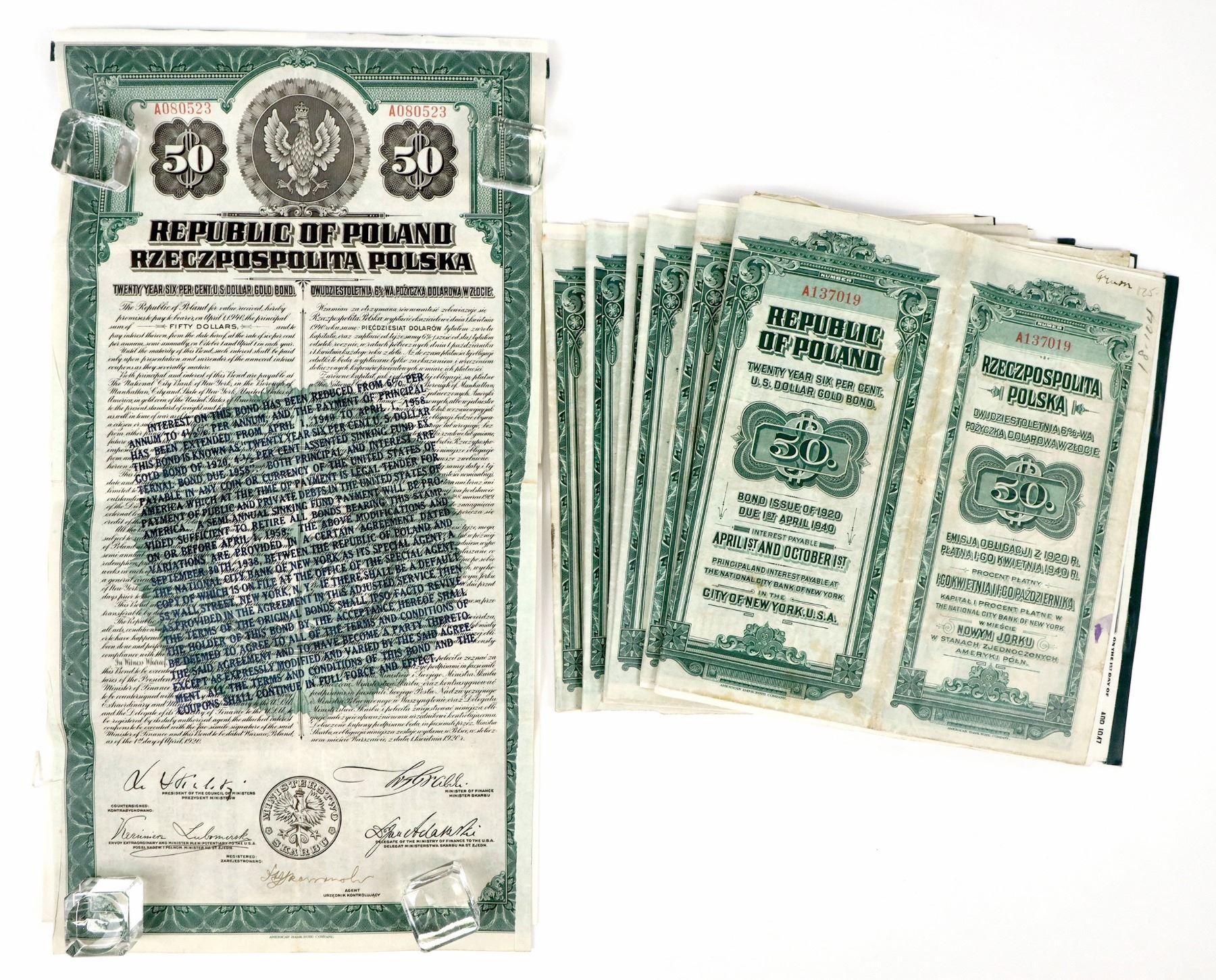 Lot of 7. I/U. Issued 1920. EF cond. Republic Of Poland, $50, 6% gold bearer bond with coupons. American BNC printer.