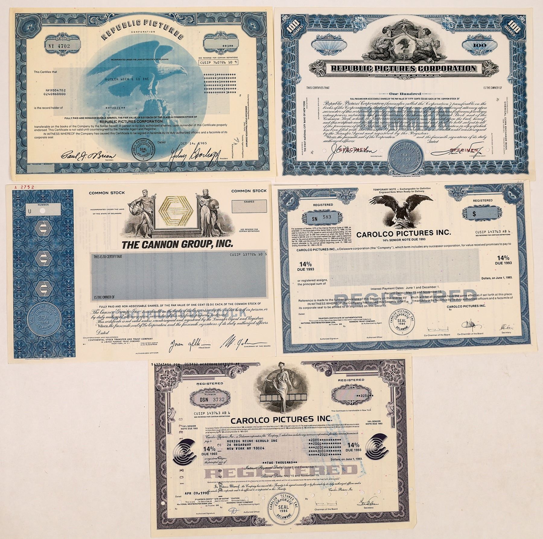 Two Republic Pictures, two Coralco Pictures and one Cannon Group stock certificates. Republic Pictures is best known for its Westerns, counting John Wayne and Roy Rogers on their roster. Carolco Pictures gave us "The Terminator" and Rambo series. The Cannon Group gave us several Chuck Norris ninja movies. Please see photos for more detail and condition.