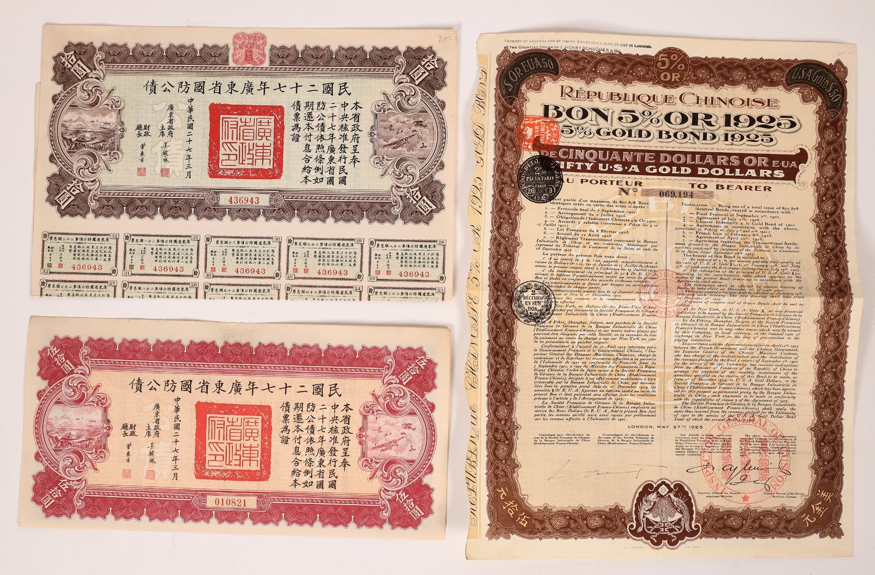Lot of 3. These bonds have some of the best designs and vignettes, along with rarity. The bonds that are Republic Chinoise are Republic of China East known as Taiwan today. 1. Two bonds #010821 & 436943 are both I/U, have great vignettes of vintage aircraft and ships. Issued by the Republic of China 1938 to raise capital for the war against Japan.#436943 has 29 coupons attached.