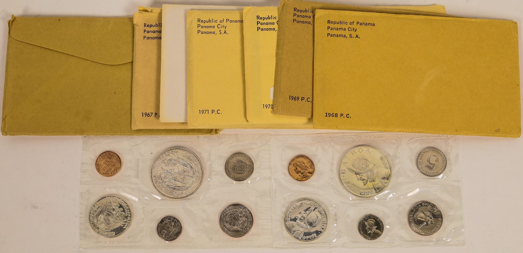 Lot of seven proof sets from the Republic of Panama in original packaging. Years 1966-1972. Each set contains six coins: un centesimo, 5 centesimo, decimo de balboa, cuarto de balboa medio balboa, un balboa. Total mintage for: 1966: 12, 701 sets; 1967 19,983 sets, struck at the U.S. Mint; 1968: 23,210 sets; 1969: 14.000 sets; 1970: 9,528; 1971: 10,696; 1972: 13,322. The one balboa is 0.900 fine silver with an asw of 0.7734oz. Many of these sets were melted in the silver rush of 1980, note to low mintages.