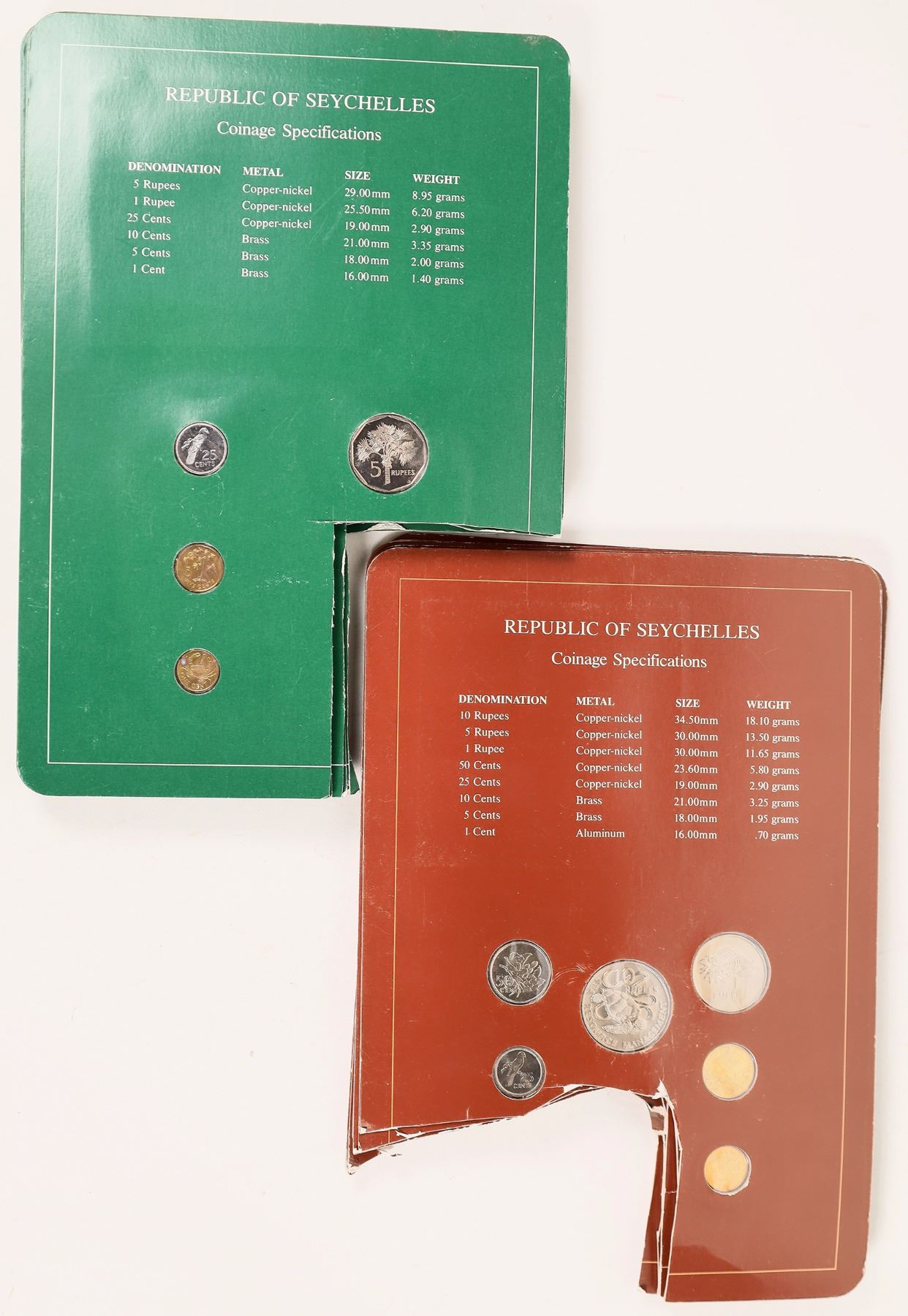 Lot of about 10 cards with coins from the Republic of Seychelles in each. These are not complete sets as the lower righthand corner has been cut out of each card. Each card lists the denomination, metal, size, and weight of each coin. Each card also contains a stamp from the Seychelles.