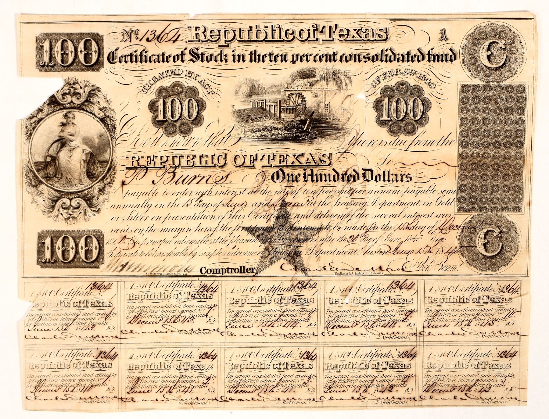 1840 Republic of Texas $100 bond. Cut cancels, small upper chip. Please inspect.