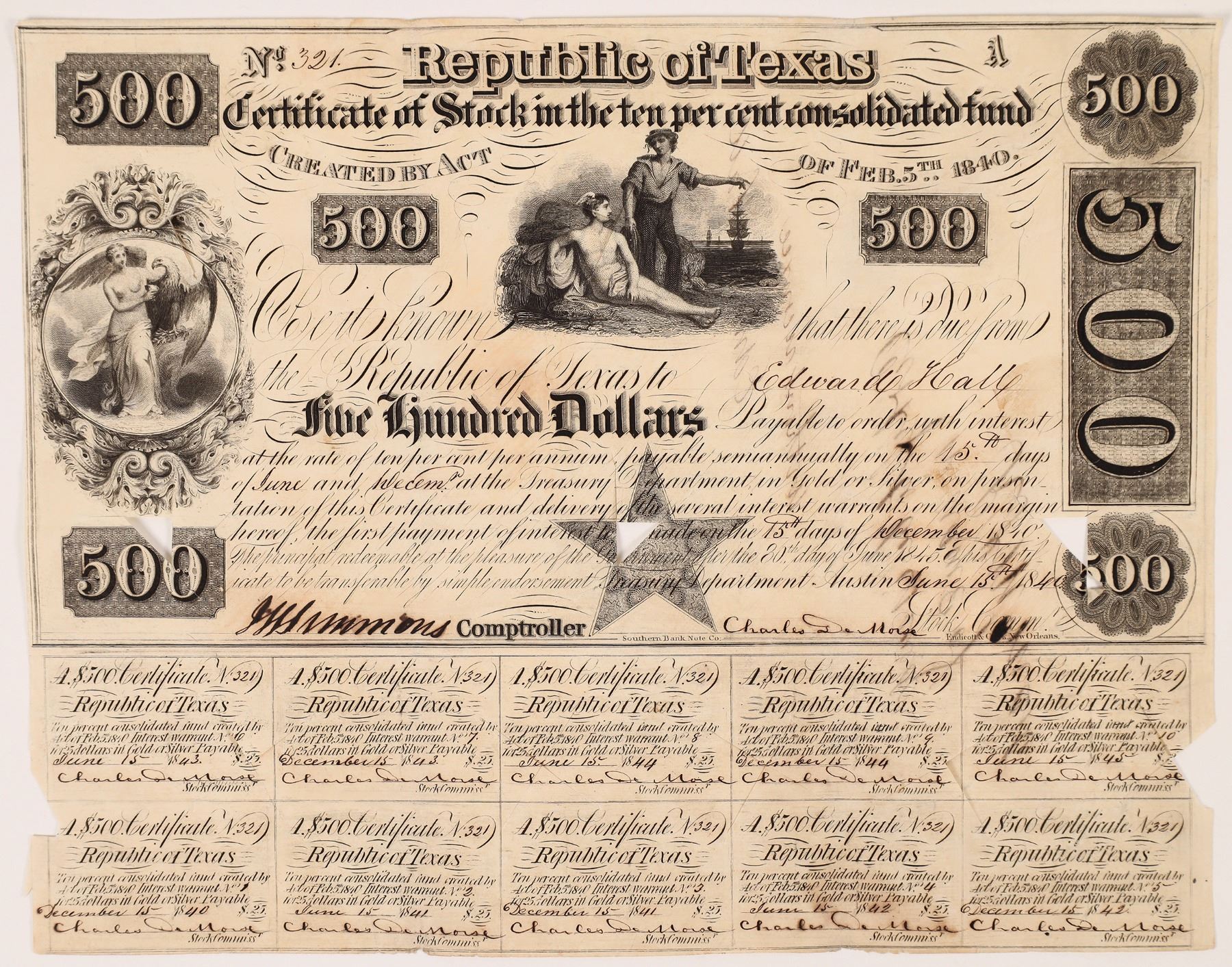 Certificate No. 321, issued December 1840 to Edward Hall for $500. Signed by Charles Demorse. DeMorse, the Texas Stock Commissioner, was tasked with funding the republic's mounting public debt under President Mirabeau B. Lamar. Co-signed by Comptroller J.W. Simmons. Allegorical vignettes. Engraved by Endicott & Clark of New Orleans. Printed by Southern Bank Note Co. Ten coupons attached. 7.75 x 10" Multiple cut/spindle cancels. Edward Hall was a cartographer. In 1836, the Texas Commissioners appointed Edward Hall to purchase and ship all supplies needed by the provincial government.