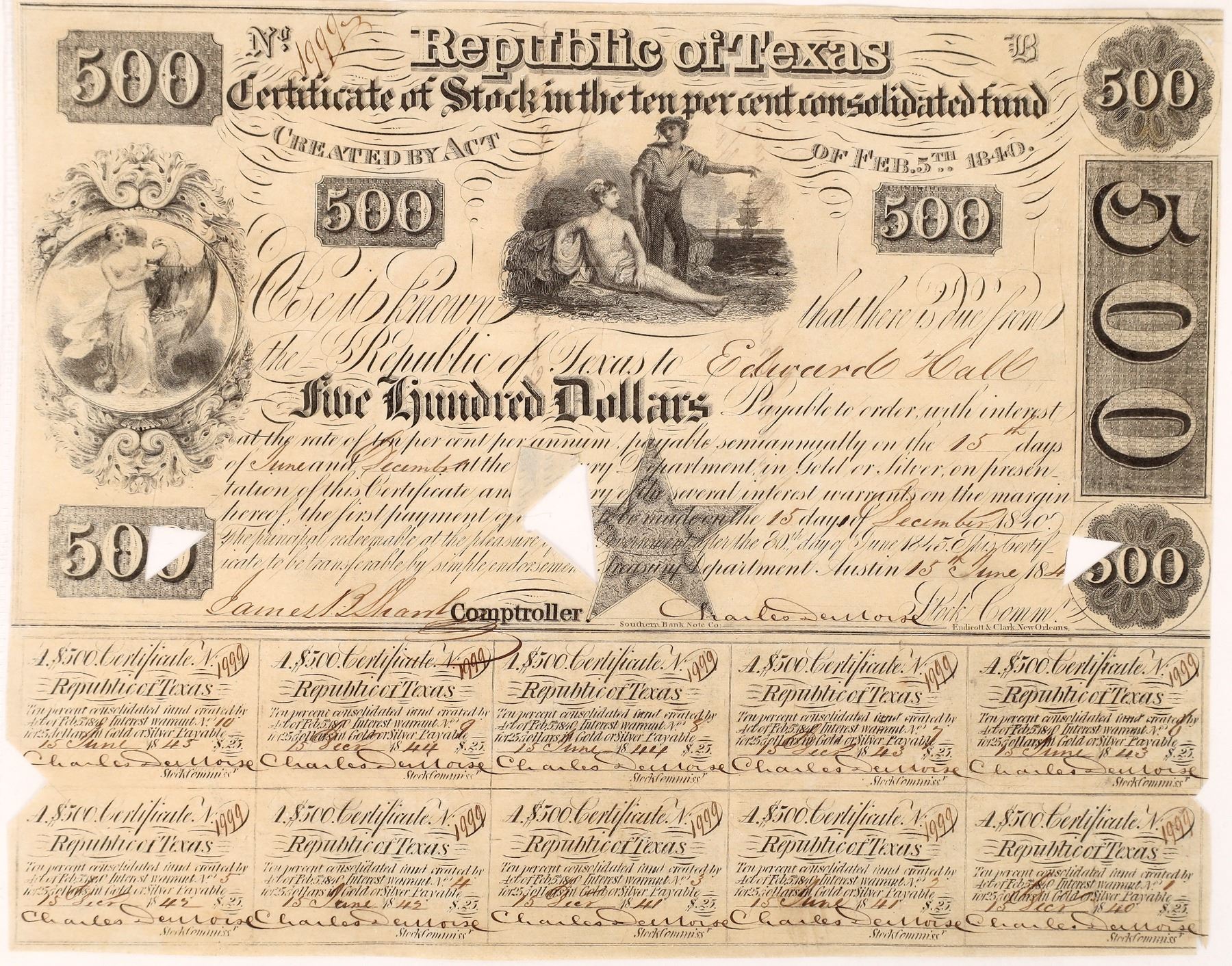 No. 1999, issued for $500 to Edward Hall in 1840. Signed by Charles DeMorse as Stock Commissioner and James B. Shaw as Comptroller. Endorsed on the back by Jackson. Two allegorical vignettes. Southern Bank Note Co. Multiple cut/spindle cancels. 10 coupons attached. 7.75 x 10" DeMorse, the Texas Stock Commissioner, was tasked with funding the republic's mounting public debt under President Mirabeau B. Lamar. Shaw was made chief clerk of the Treasury Department in 1838, and in 1839 was elected comptroller, a position that he held until 1859. Shaw frequently served as acting secretary of the treasury during Sam Houston's second administration. In December 1850 Shaw was sent to Washington, D.C., to collect the $5,000,000 payment of the federal government resulting from the Compromise of 1850. Edward Hall was a cartographer. In 1836, the Texas Commissioners appointed Edward Hall to purchase and ship all supplies needed by the provincial government. Texas Ken Prag Collection
