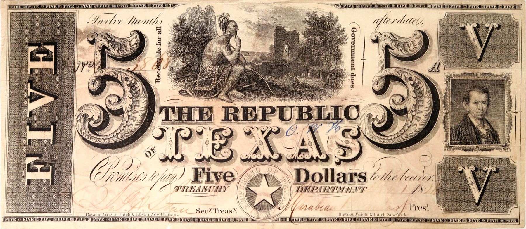 Republic of Texas, Criswell A4 $5 obsolete bank note. 1840. R5. VF/XF dealer grading-note there is a 1" lower left crease tear. [Austin] [Texas] [] [] []