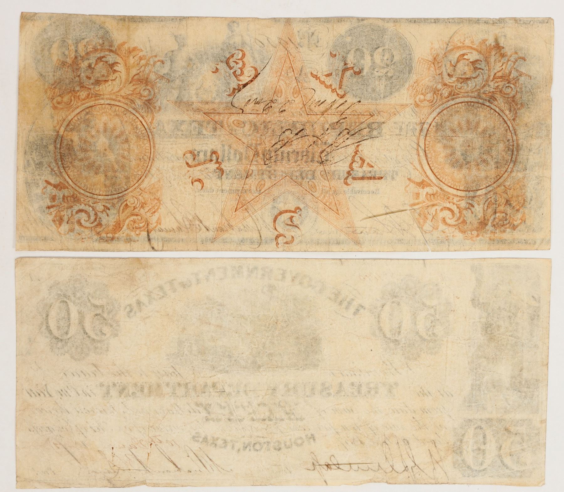 Lot of 2 different. 1) Republic of Texas, (Austin), $20, 1840. This currency is a promissory note payable 12 months after date. It is signed by Mirabeau B. Lamar, who served from 1838 to 1841 as the second president of the fledgling nation. 2) Government of Texas, Houston, $50, 1839? This is a bearer note payable one year from date. Also signed by Lamar as president, this note was printed just before the country's capital was moved from Houston to Austin. Both notes have numerous cut cancels. Both about 3 x 7"