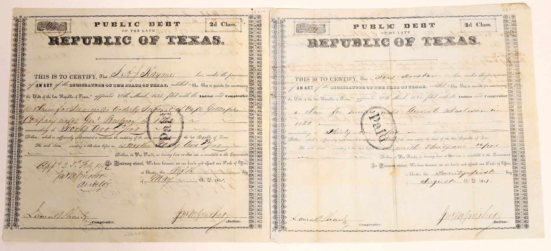 Burleson was a colonel in the battle of San Antonio. Both received funds for 1842 services rendered. Houston was listed as directly under the general. He received $31.50. Haynie was an orderly Sergeant in the company of Captain Gillespie under the general. Captain James H. Gillespie had a company of (Bastrop) Volunteers and were involved in the Vasquez Campaign. The campaign took place in March of 1842, but Haynie was not yet on the rolls. He received $42.70. S. A. J. stands for Stephen Andrew Jackson. He came from Burnet County and the 1860 slave schedule lists him as having five slaves from 1 to 21 years of age.