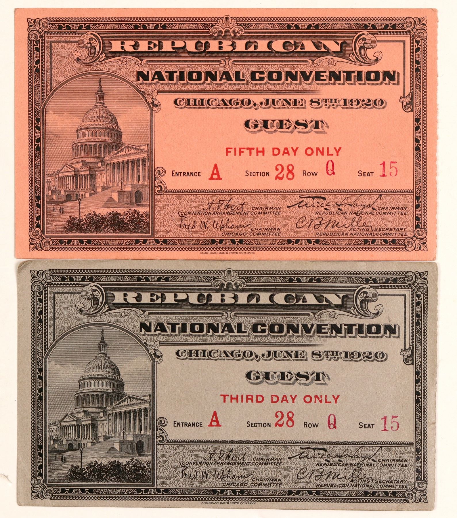 Two guest passes for the Republican National Convention, Chicago, June 8th 1920. One orange, one gray, 4 1/2 x 2 1/2 inches. Signed by: Chairman Convention Arrangement Committee, Chairman Republican National Committee, Chairman Chicago Committee, Acting Secretary Republican National Committee. The Convention nominated Ohio Senator Warren G. Harding for President and Massachusetts Governor Calvin Coolidge for Vice President.