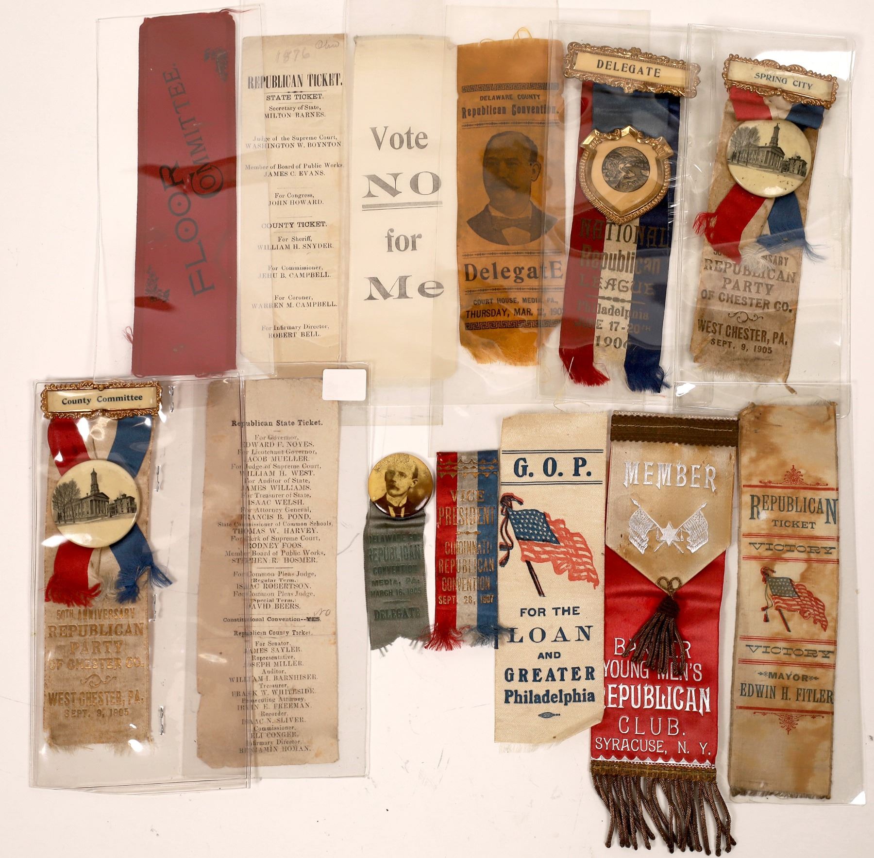 Lot of 13: Various G.O.P. medals/ribbons from conventions, committees, clubs. Highlight of collection is a Delegate medallion w/ribbon for the National Republican League, Philadelphia, June 17th -20th, 1906. Two of the 13 items appear to be newspaper clippings declaring Republican State Tickets, one from Ohio from 1876.
