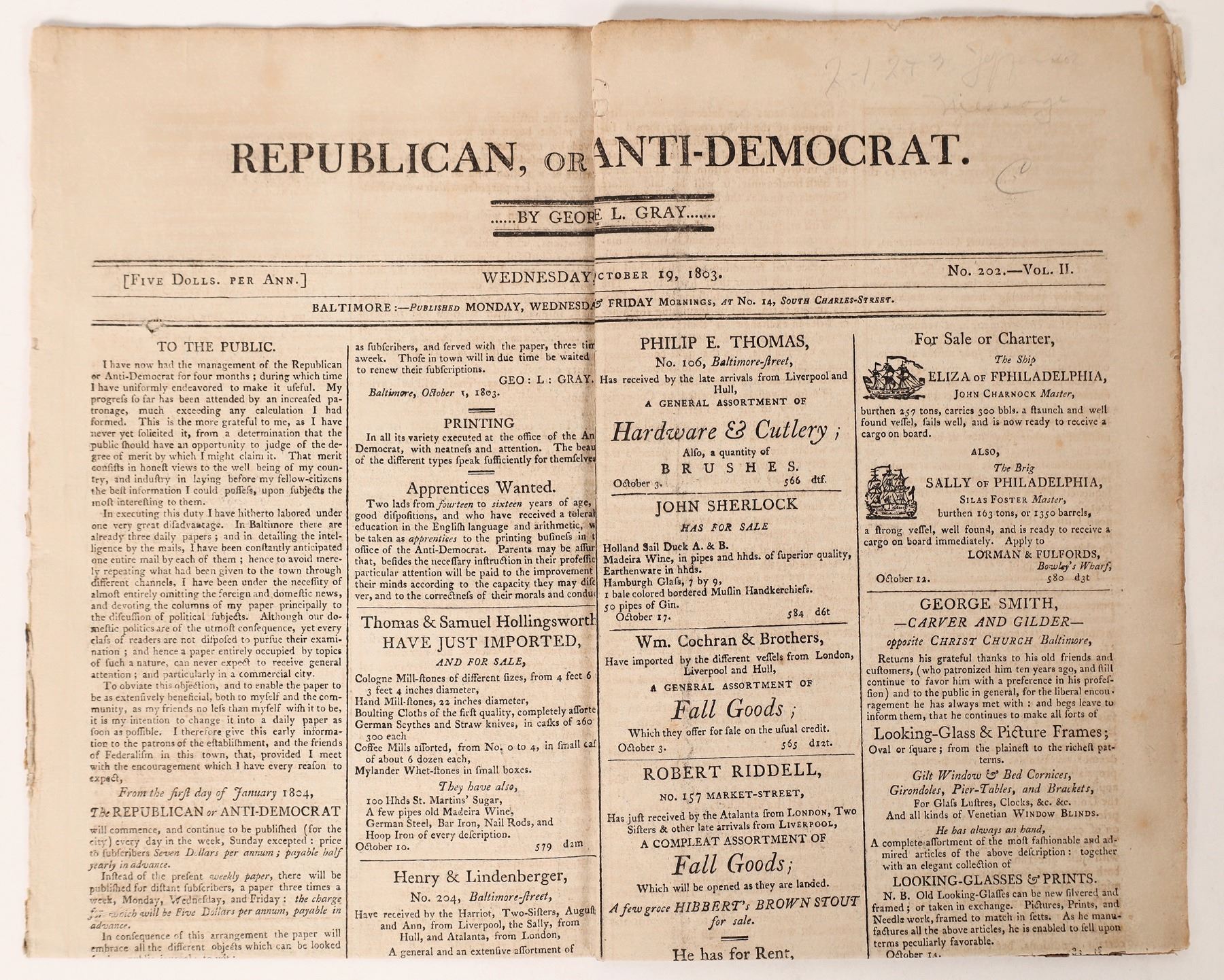 Four page broadsheet newspaper published Wednesday, October 19, 1803 in Baltimore by George L. Gray. The newspaper's banner is "Republican or Anti-Democrat". Featuring a column on the Louisiana Purchase, and an advertisement to purchase a Negro woman. Fascinating reading! 1803