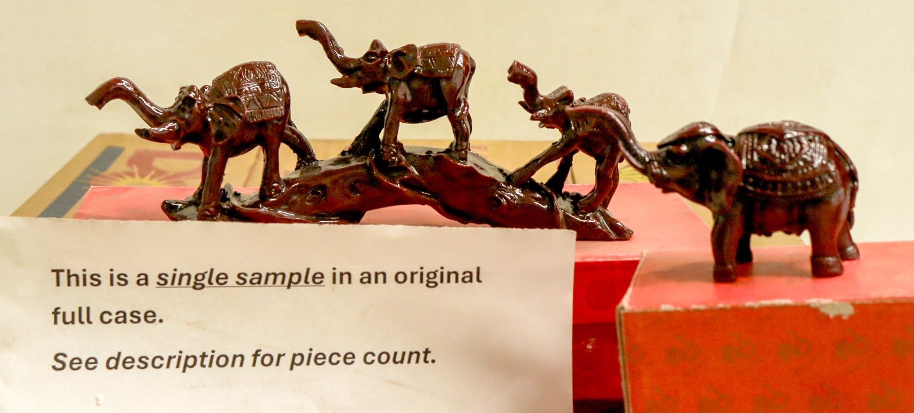 8x 2.75x3.25" resin elephants and 15x 3.75x8" resin 3 elephant trains. These items have been in storage for 20 years and have not been inspected. Sold as is.