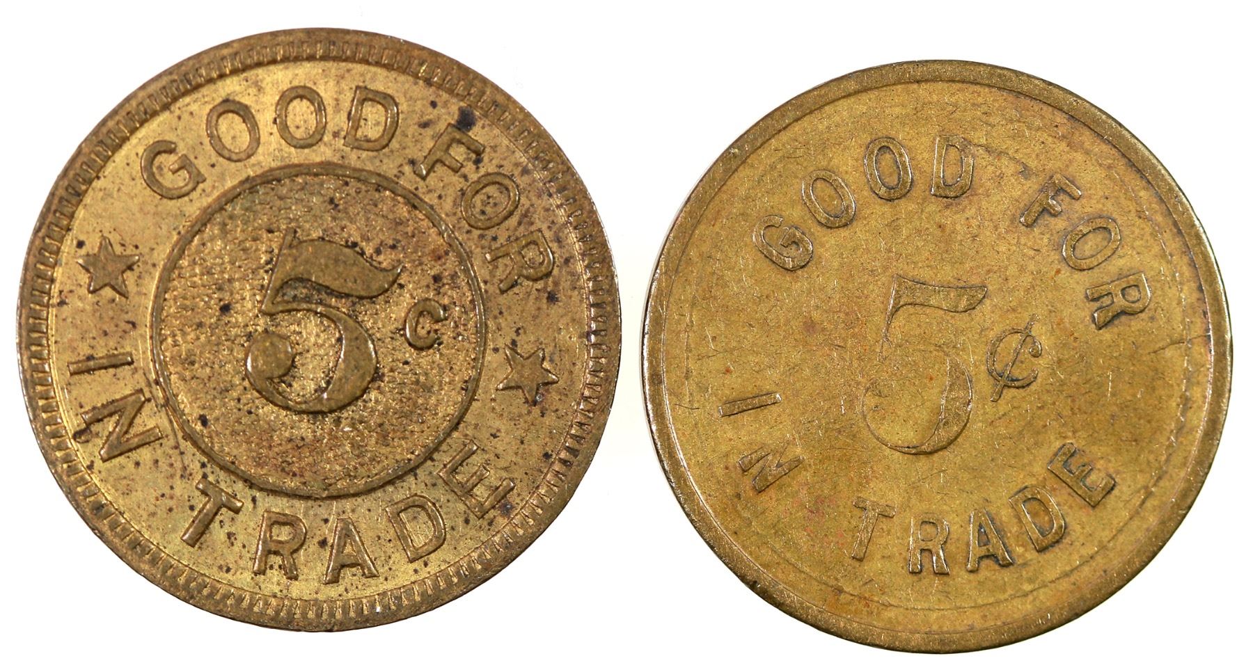 Lot of two: 1) Resort Saloon / Baker City / Ore. // Good For / 5c / In Trade; Br., rd., 21 mm, R 4. 2) Resort Saloon / Baker / Ore. // Good For / 5c / In Trade; Br. rd., 21 mm. The Baker City post office was established in 1862, the name was changed to Baker in 1911, and renamed Baker City in 1990. [ Baker Oregon