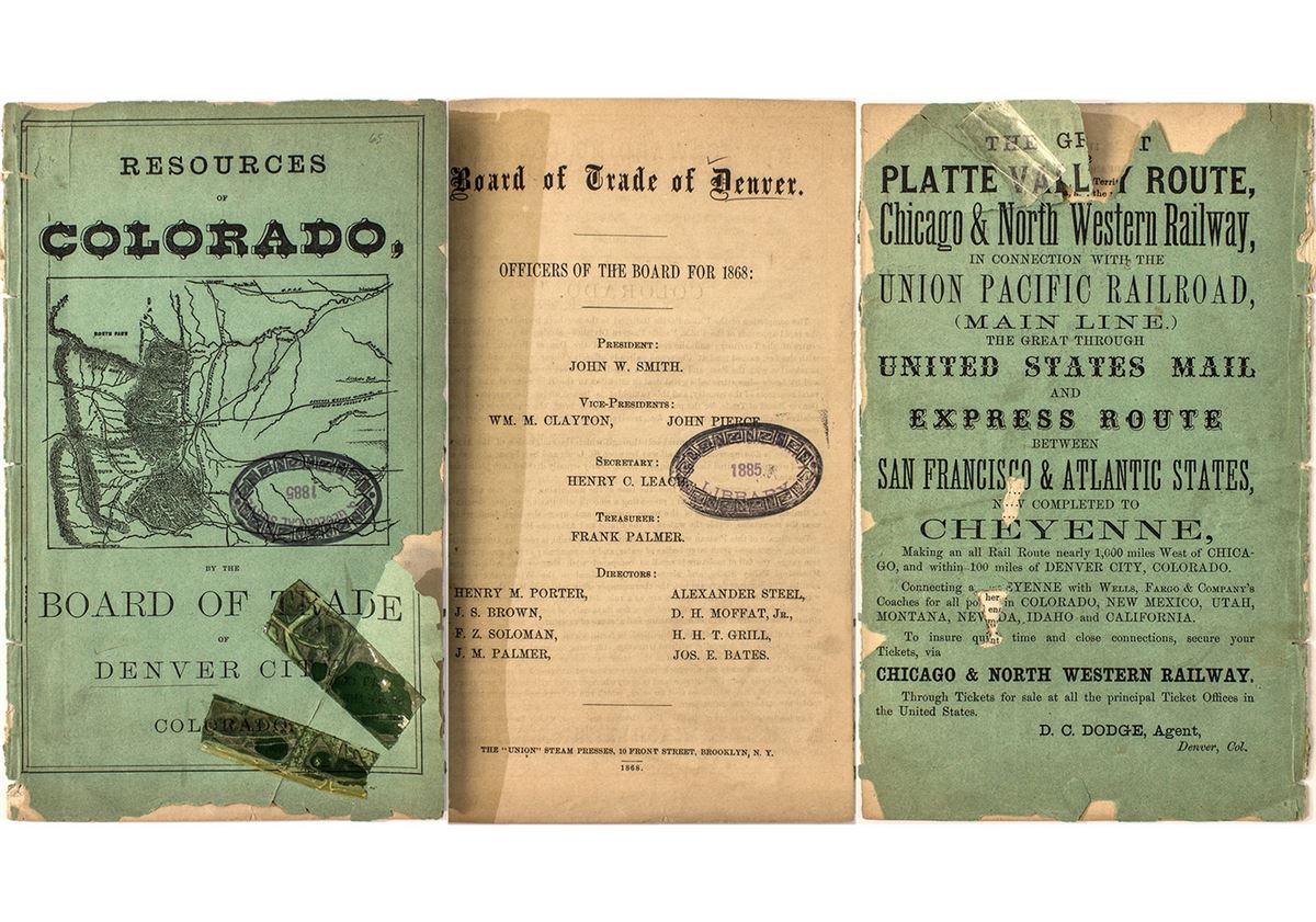 Pamphlet (published by the Board of Trade, Denver. (8.5" x 5.25") 12 pp. Printed by The "Union" Steam Presses, Brooklyn, NY. Green cover, torn and taped (not archival), inside pages fine, except a torn spot missing (1/8"wide at top x 12" long) on lower 1/3 of p. 7 through to back cover. Geological Survey Library stamp dated 1885 on cover and first page. Wormholes last 4pp.