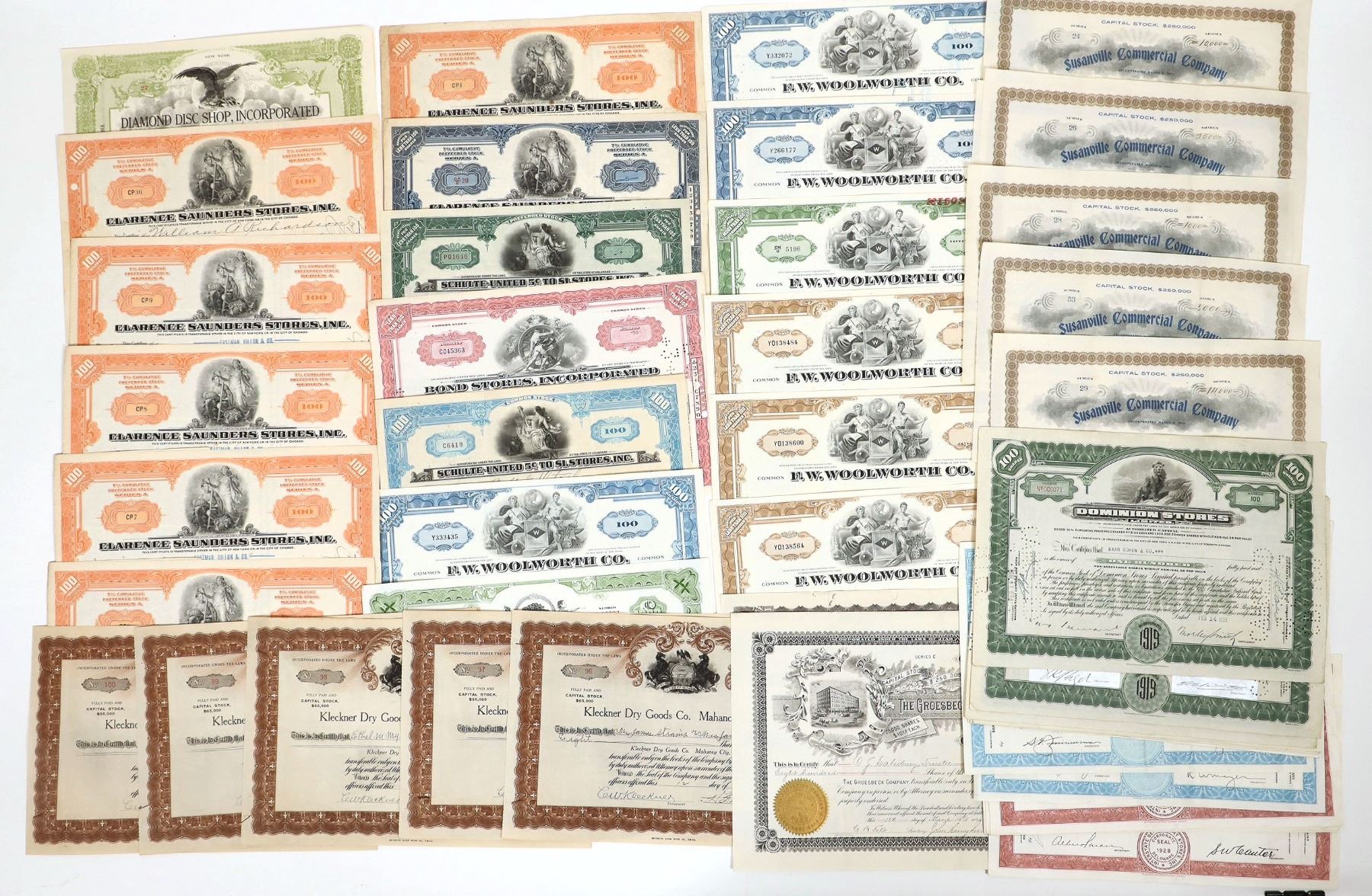 All issued. 5x 1969 Interstate Department Stores, 1970 and 1973 W T Grant, 2x 1971 Allied Stores, 5x 1950 Gimbel Brothers, 3x 1936 Dominion Stores, 5x 1902-03 Susanville Commercial, 5x 1944 Kleckner Dry Good Mahanoy City, PA, 1x 1909 Groesbeck, 1x 1958 Wharton Store, 2x 1974 brown and 2x 1974 green and 2x and 1x 1974 blue 1972 F W Woolworth, 1x 1972 Broadway Hale Stores, 1x 1954 Bond Stores. Schulte-United 5c to $1 Stores-1x 1929 blue, 1x 1929 green, 1x 1930 blue. 5x 1930 Clarence Saunders Stores.Unissued-1x Diamond Disc Shop.