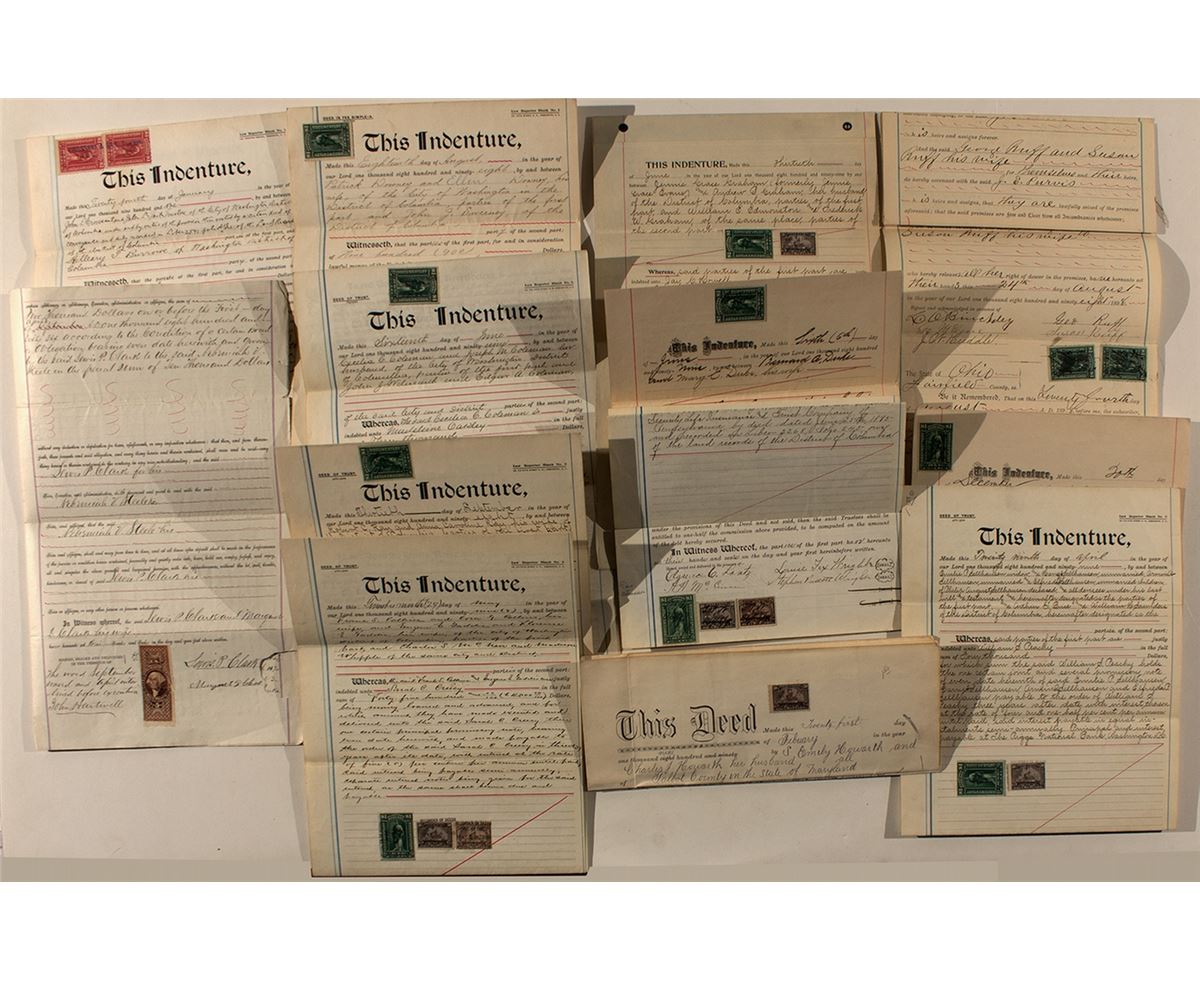 Thirteen revenue stamped documents from 1864 through 1901. Deeds of Trust, Indentures, Warranty Deeds, Deeds, etc. Treasure trove for the revenue stamp collector.