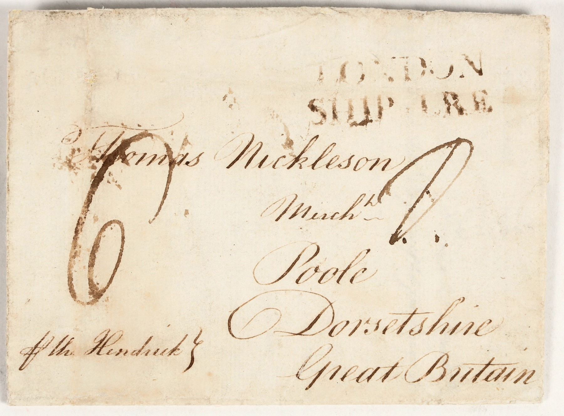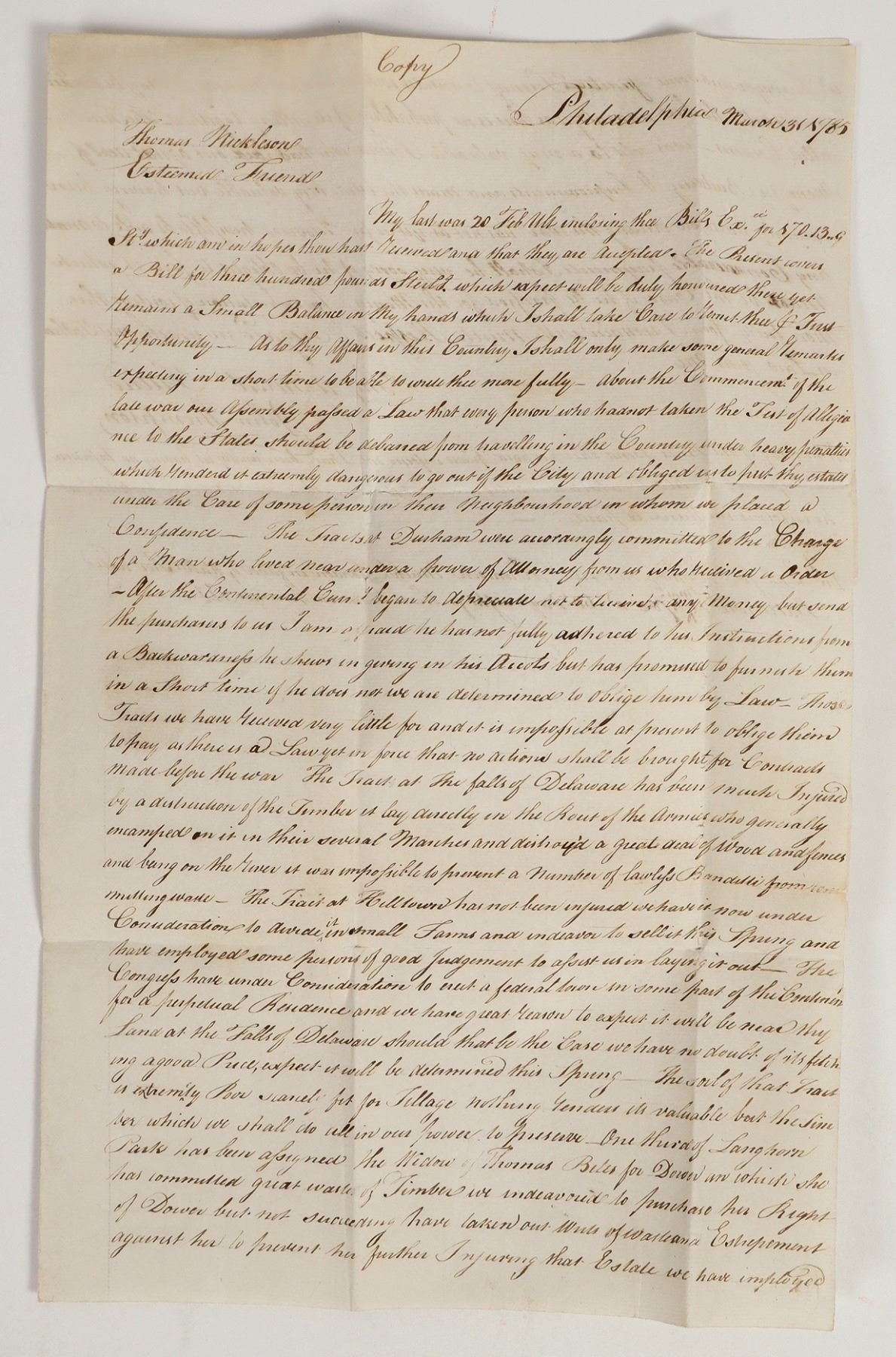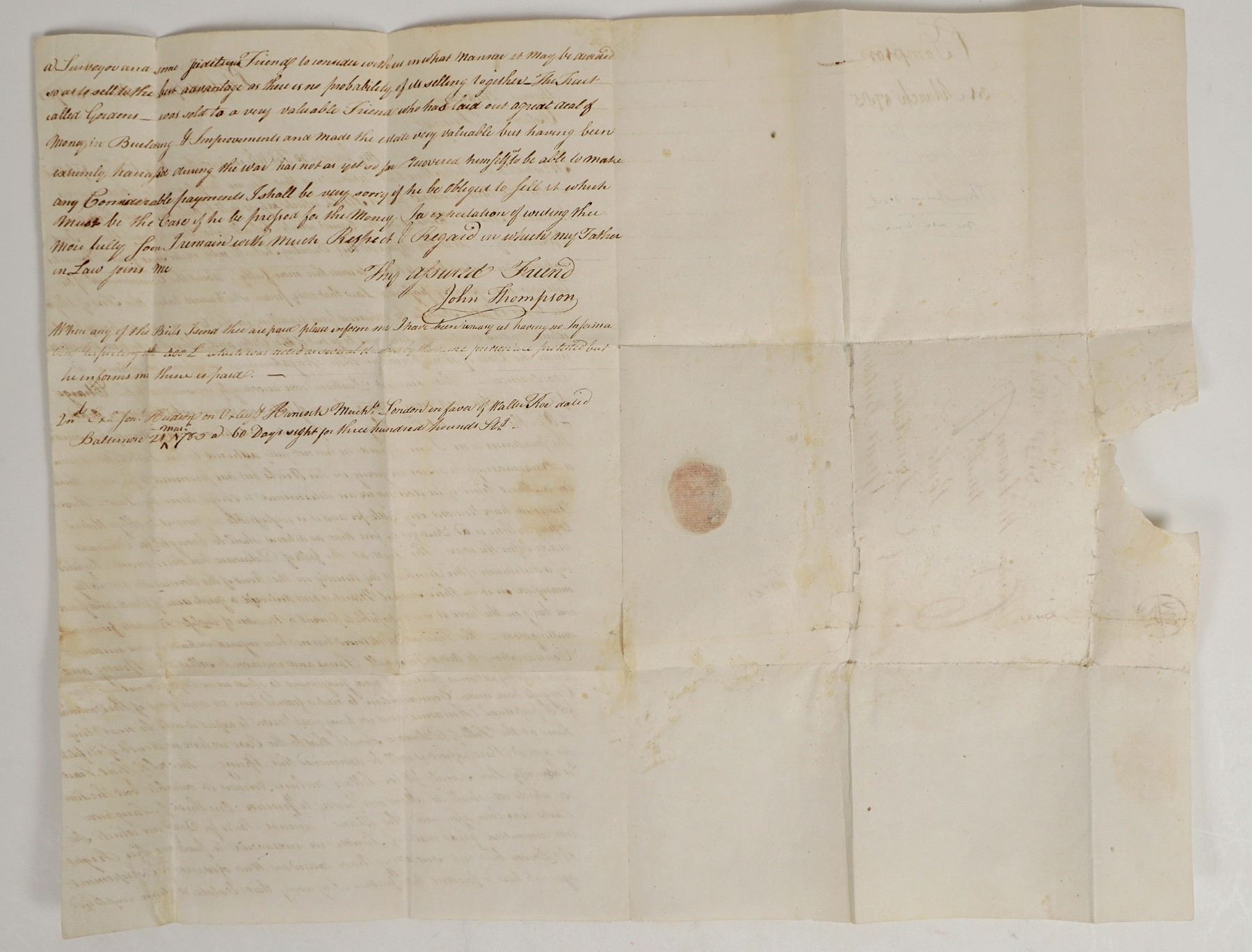 1785 Stampless Letter Philadelphia to Great Britain War Damage to British estates in Bucks County PA describing the damage to British owned properties during the war and the sentiments of Americans against the Englishman. In very good condition. There is a dispute of bill where the writer refers to "The Continental Cuss" not fulfilling his obligations. This is in very good condition and readable with excellent penmanship.