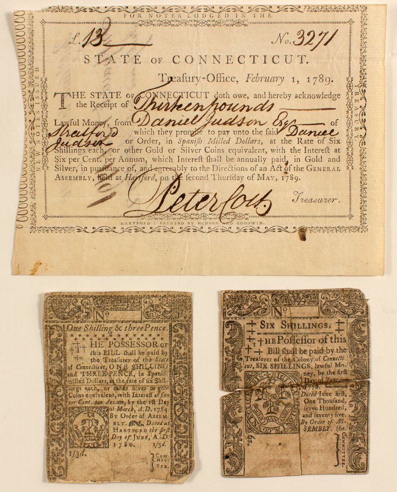 1789 notes from the State of Connecticut for 13 pounds; two pieces of continental currency: one shilling & three pence, and six shillings. Prag collection.