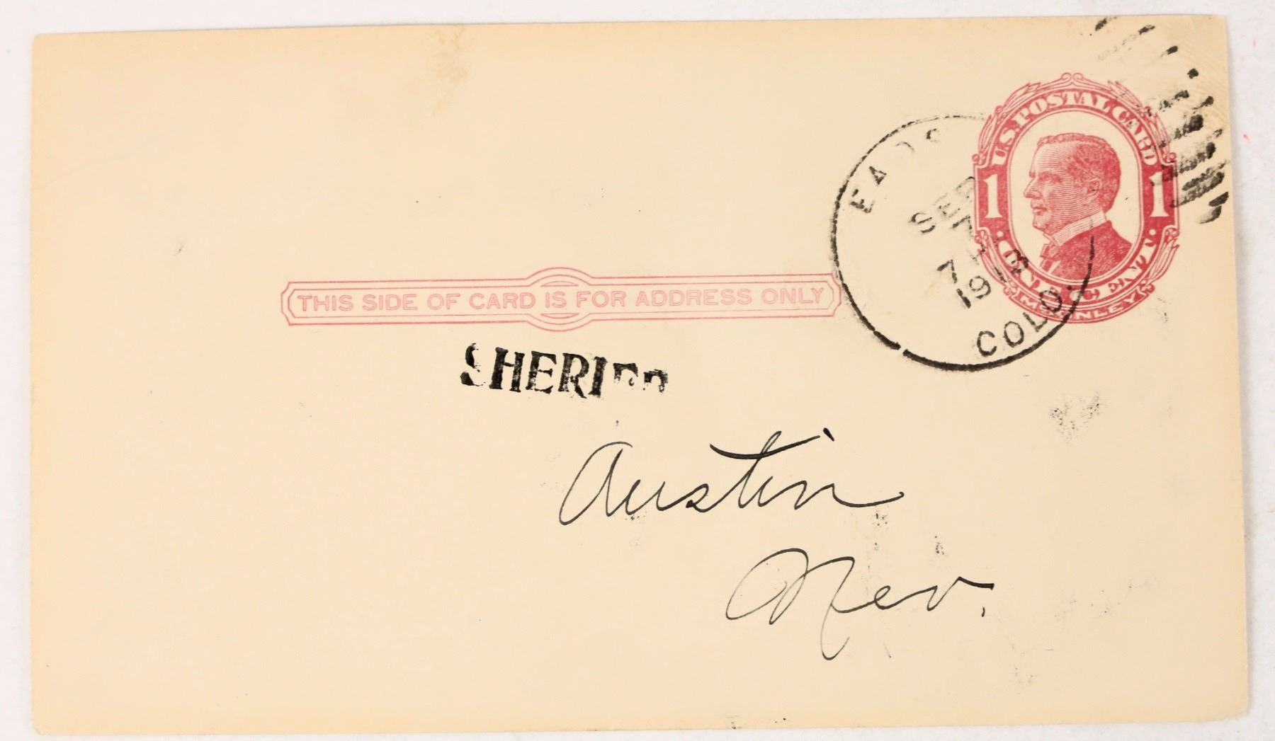 Postcard send from the sheriff of Eads, Colorado to the sheriff at Austin, Nevada, regarding Ira Kindler, a horse thief. With photo vignette.