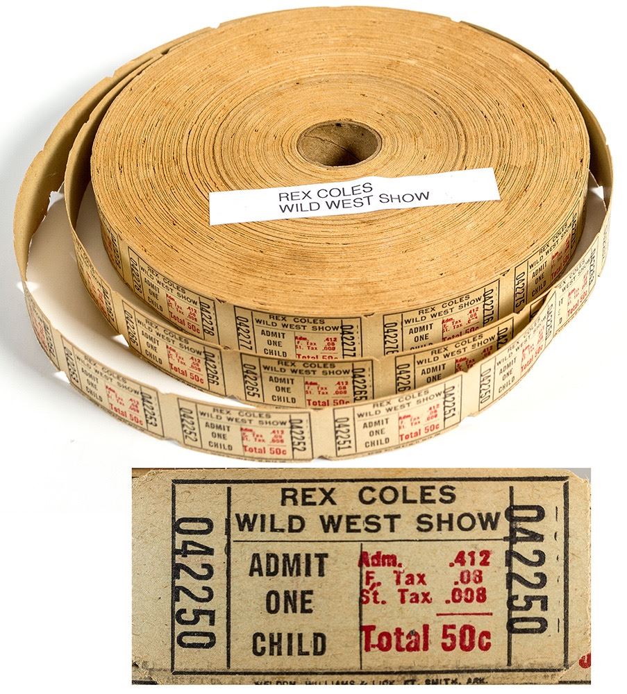 c1940's. Large roll on hundreds of tickets for Rex Cole's Wild West Show. Price - 50c. Admit one child! City: State: Date: HWAC# 43924
