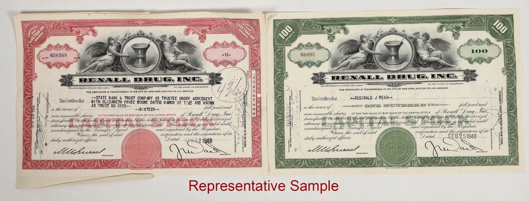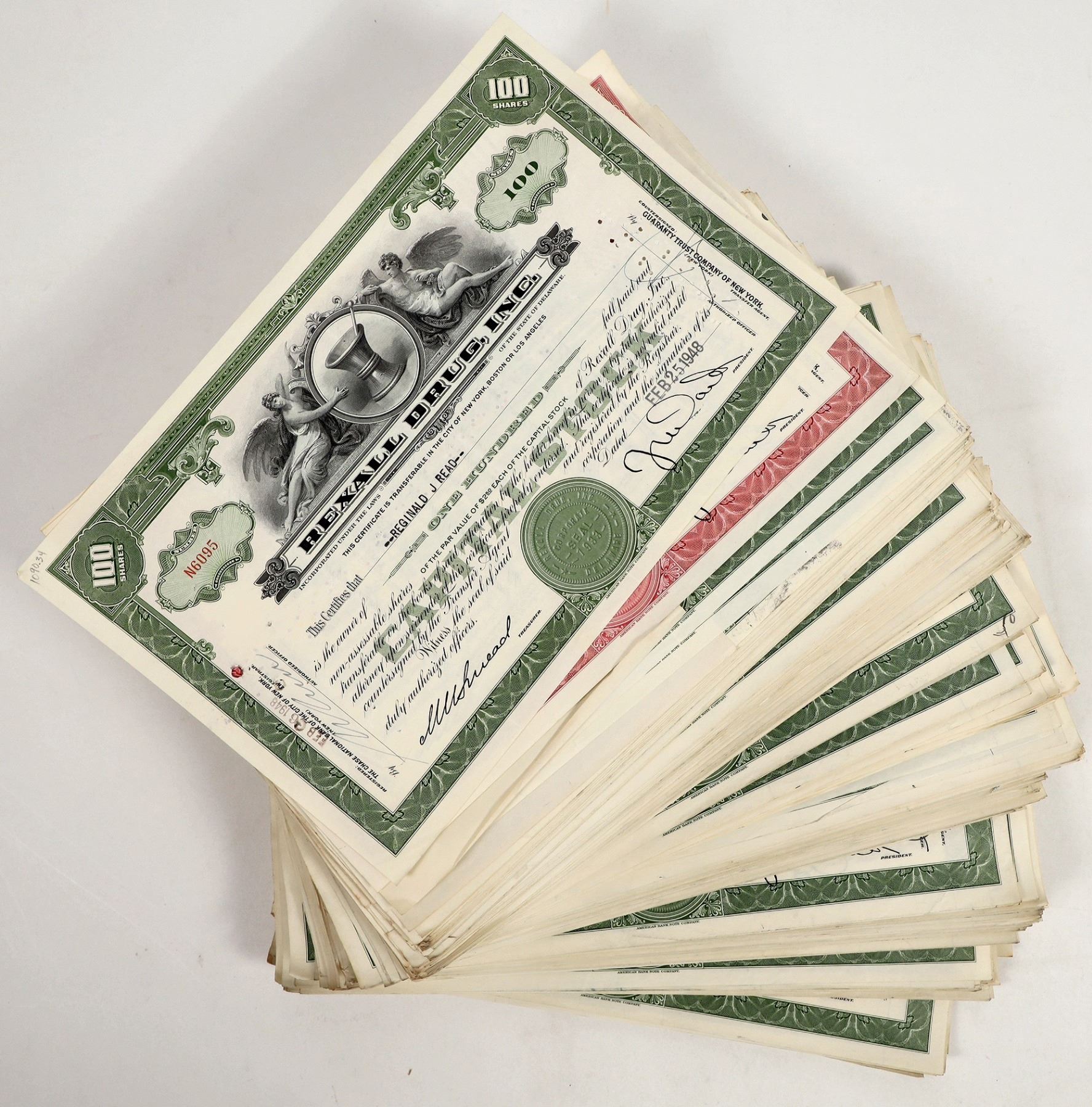 Rexall Drug, Inc. stocks group, approx. (250 or more) certificates, (2) varieties, issued 1948-1950. National name, see photos.