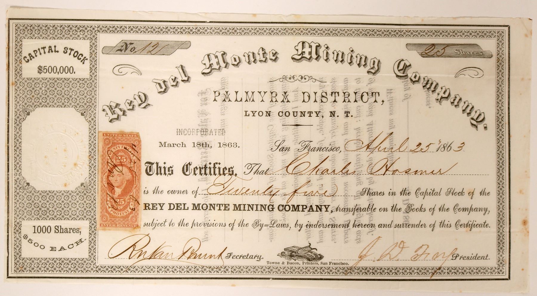 Early number 12 for 25 shares to Charles Hosmer. Signed by RN Van Brunt (mining secretary, 706 Montgomery) and president JD Fry(?). Hosmer was a mining stock broker. However, on September 29, 1860: With two partners purchased 20 feet of the Copperas Tunnel claim. Used a promissory note dated April 1, 1861 to secure it. This shows a definite Nevada connections The area was still in the Utah Territory at this time. [Records of Carson County, Utah and Nevada Territories by Ellison]. Dateline San Francisco 1863. Incorporated March 18, 1863. Not cancelled. 25c Protest revenue stamp. Location: Palmyra District, Lyon County, N. T. Towne & Bacon printer. Nicks along borders. Dog ear upper left. Overall very nice. The Sacramento Daily Union reported on December 12, 1862 (four months before incorporation) that the Rey del Monte of Palmyra is "yileding rock of extraordinary richness." The ore shows plenty of free standing gold and silver. And the "owners are industriously engaged in raising ore from their mine for crushing next spring." The larger Como district was located at the north end of the Pine Nut Mountains, extending generally from Lyon Peak on the south to the Carson River on the north. The Palmyra district, which included the towns of Palmyra and Como, was organized in 1862 in the Pine Nut Mountains 8 miles southeast of Dayton between the Sullivan (to the southwest) and Indian Springs (to the northeast) districts. [Nevada Mining Districts by Tingley] Ken Prag Collection