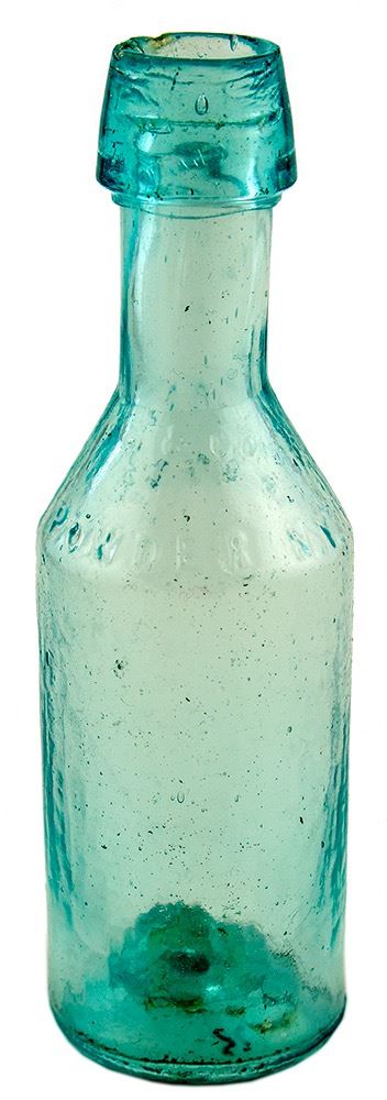Reynard's Insect Powder Small aqua bottle, 5 inches tall, in the shape of the Lyons Powder. Open pontil. Wear along the top of lip, please inspect. City: State: Inventory Number: 38978