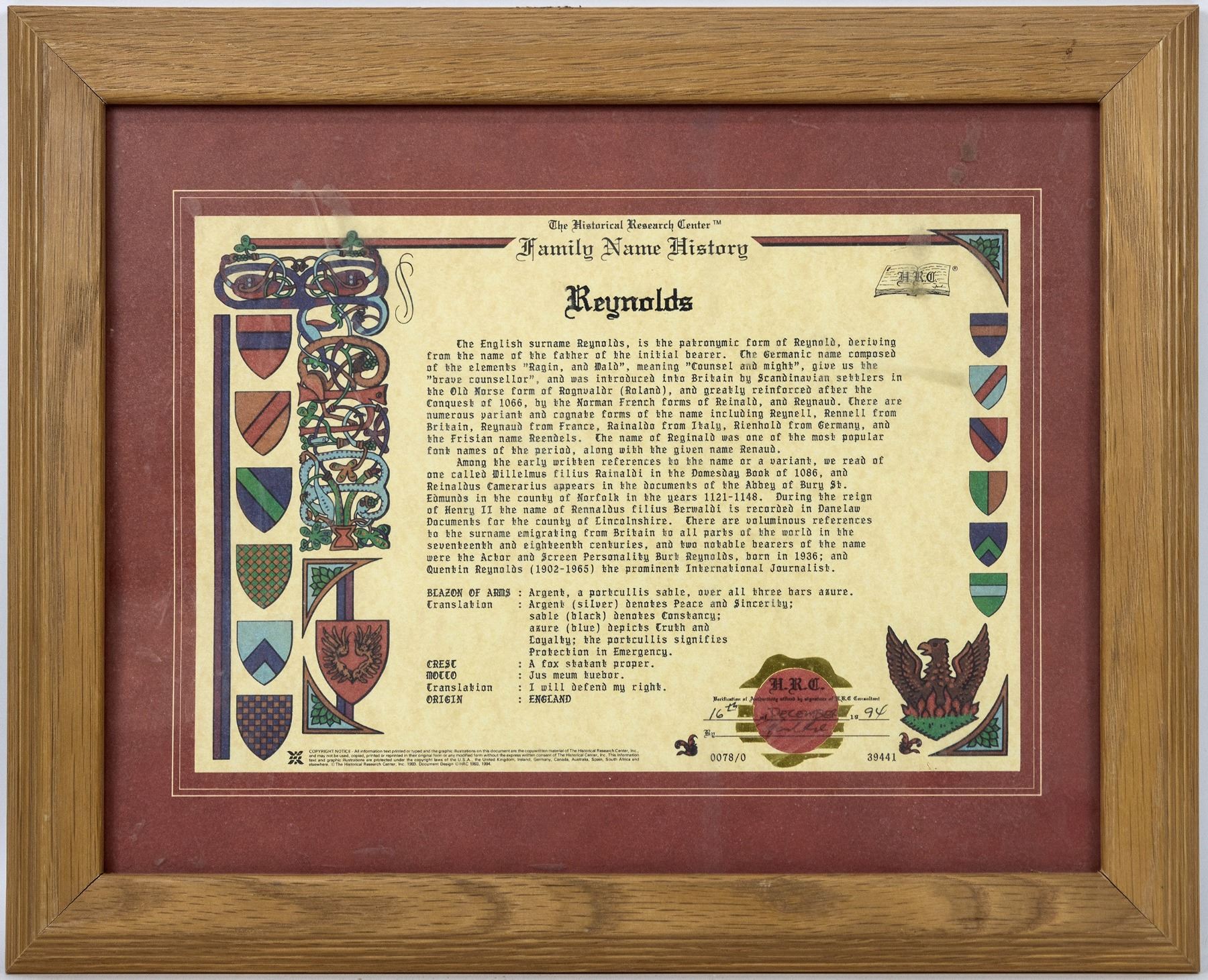 Origin of Reynolds family name from Germanic. Framed 13.25x 16.5.