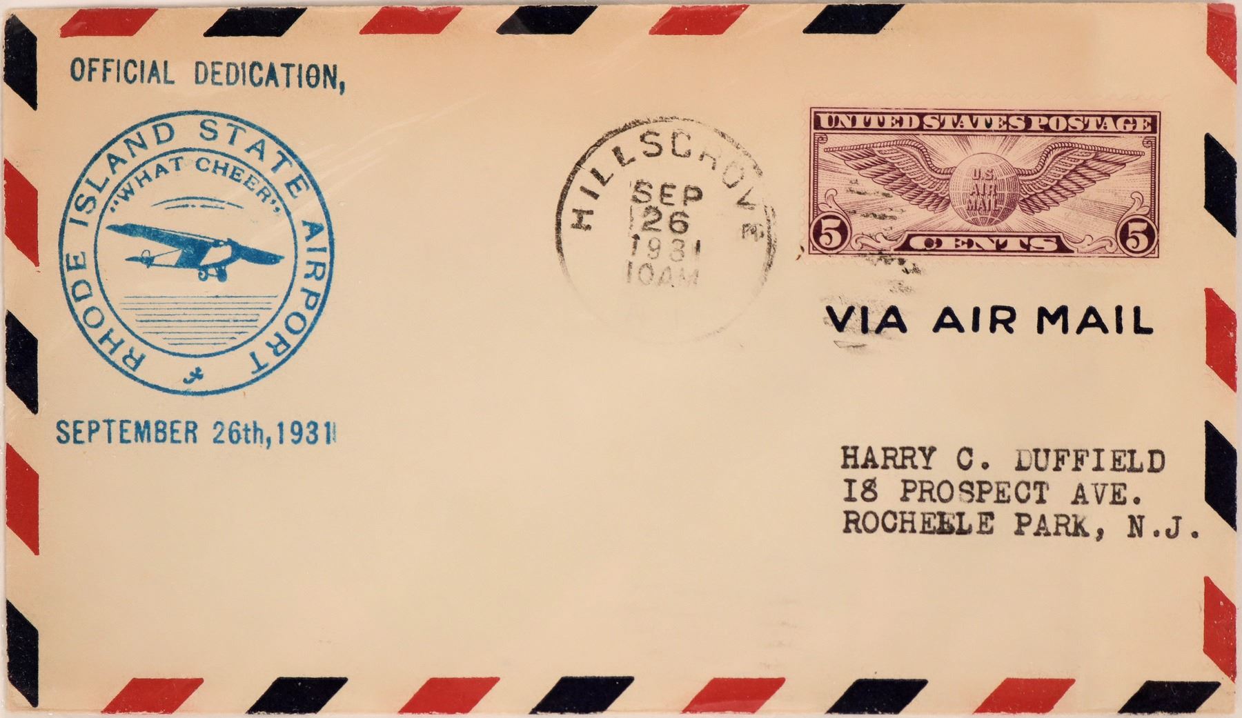 A dedication cover postmarked September 26, 1931, with enclosure, for the opening of the Hillsgrove State Airport, in a town then called Hillsgrove, now a village in Warwick, RI. The airport was the first state-owned and operated airport in the United States. It was formally dedicated on September 27, 1931, and two air shows drew a crowd of over 150,000 - the largest crowd that had attended a public function in the country until that time. In 1938 the airport was renamed Theodore Francis (T.F.) Green State Airport in honor of Green, who served as Rhode Island's Governor from 1933-1937, then as U.S. Senator, and who was an avid supporter of aviation.
