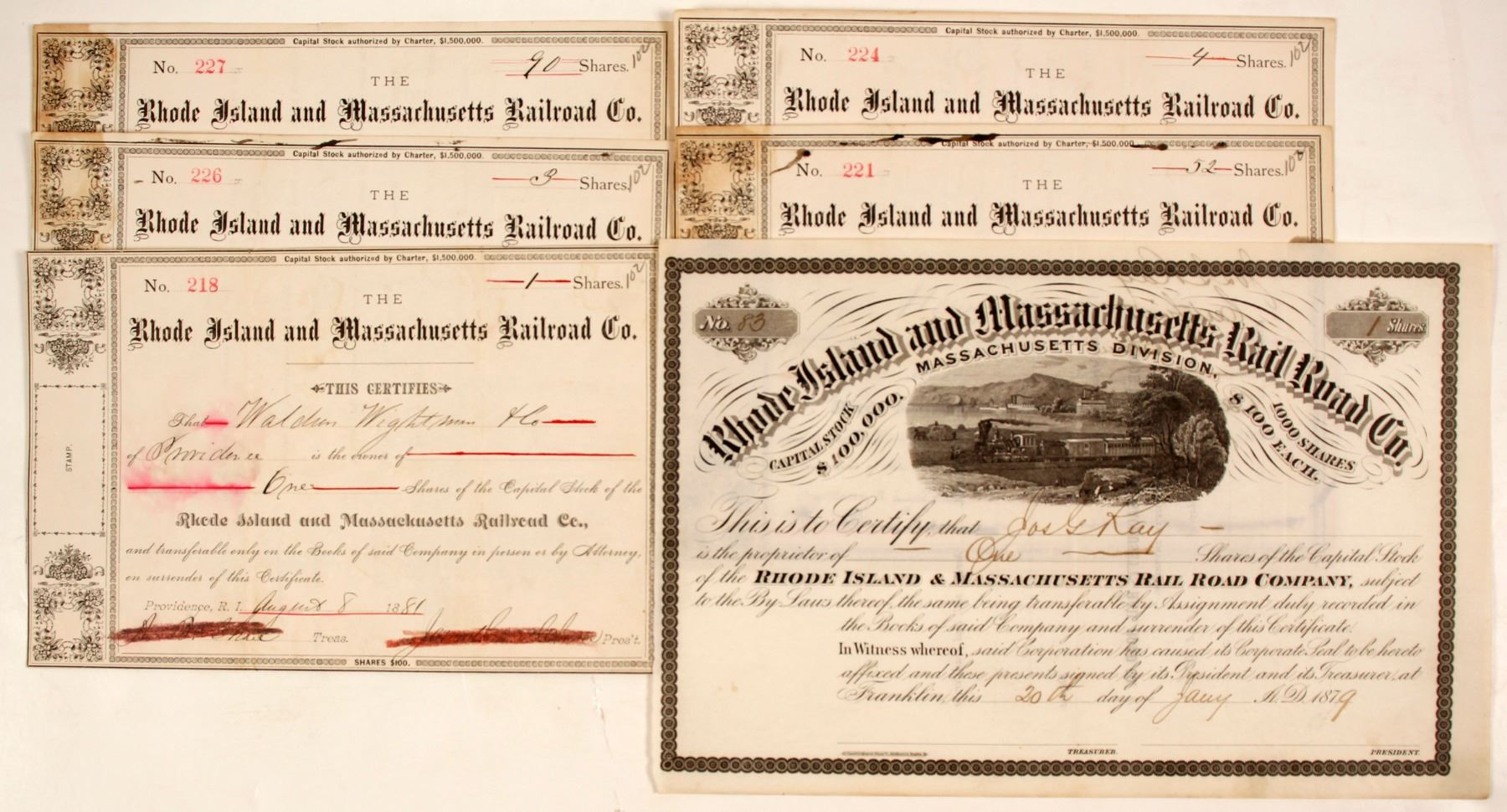 6 total certificates. 5 are 6"- 9"; all signed and canceled by illegible via signature strike. 1 is 11.5"x 7", it has not been signed or canceled; all are in good condition, some discoloration. Not listed in Cox. . Ken Prag Collection