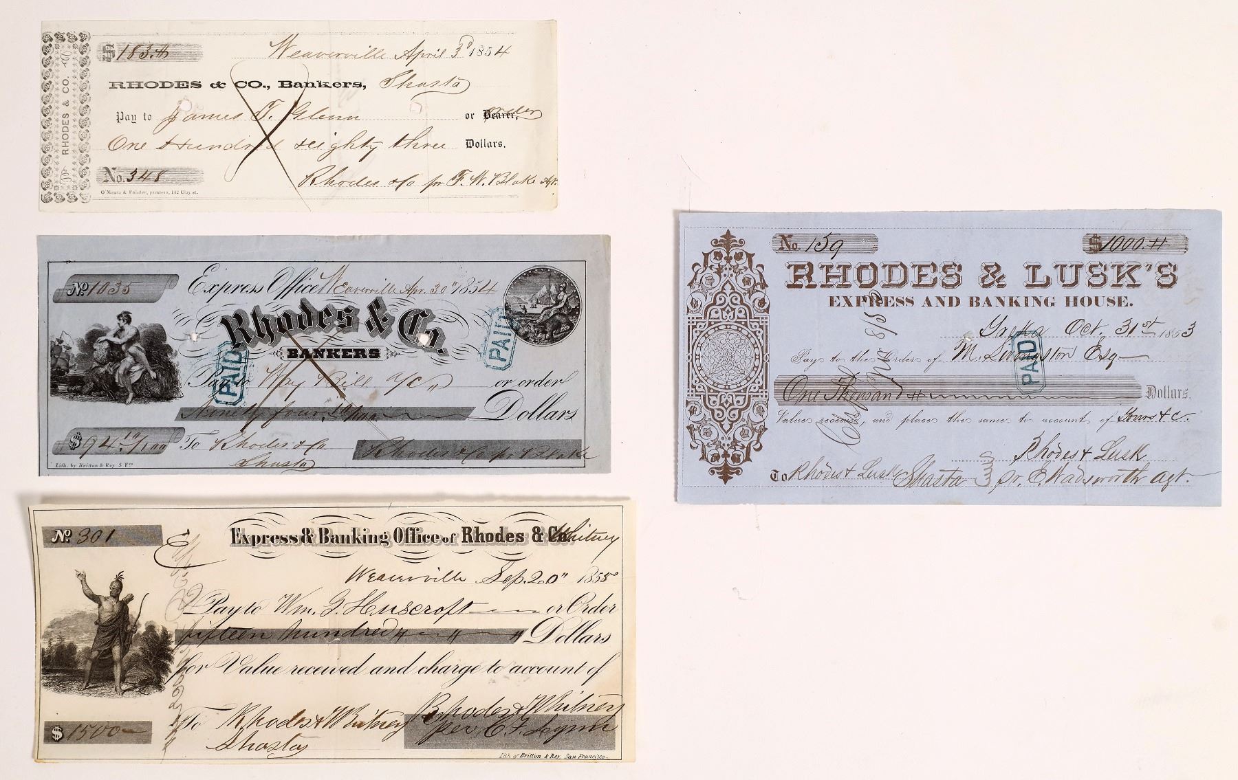 Four different checks from Rhodes & Co. dated 1853, 1854 (x2), and 1855. Three are from Rhodes & Co., Bankers in Weaverville, California. The fourth is from Rhodes & Lusk's Express and Banking House in Yreka. Rhodes also worked in Shasta and the Trinity County gold region. One of these checks is signed by F.W. Blake, an agent and assayer. All four checks are in good condition, two have vignettes.
