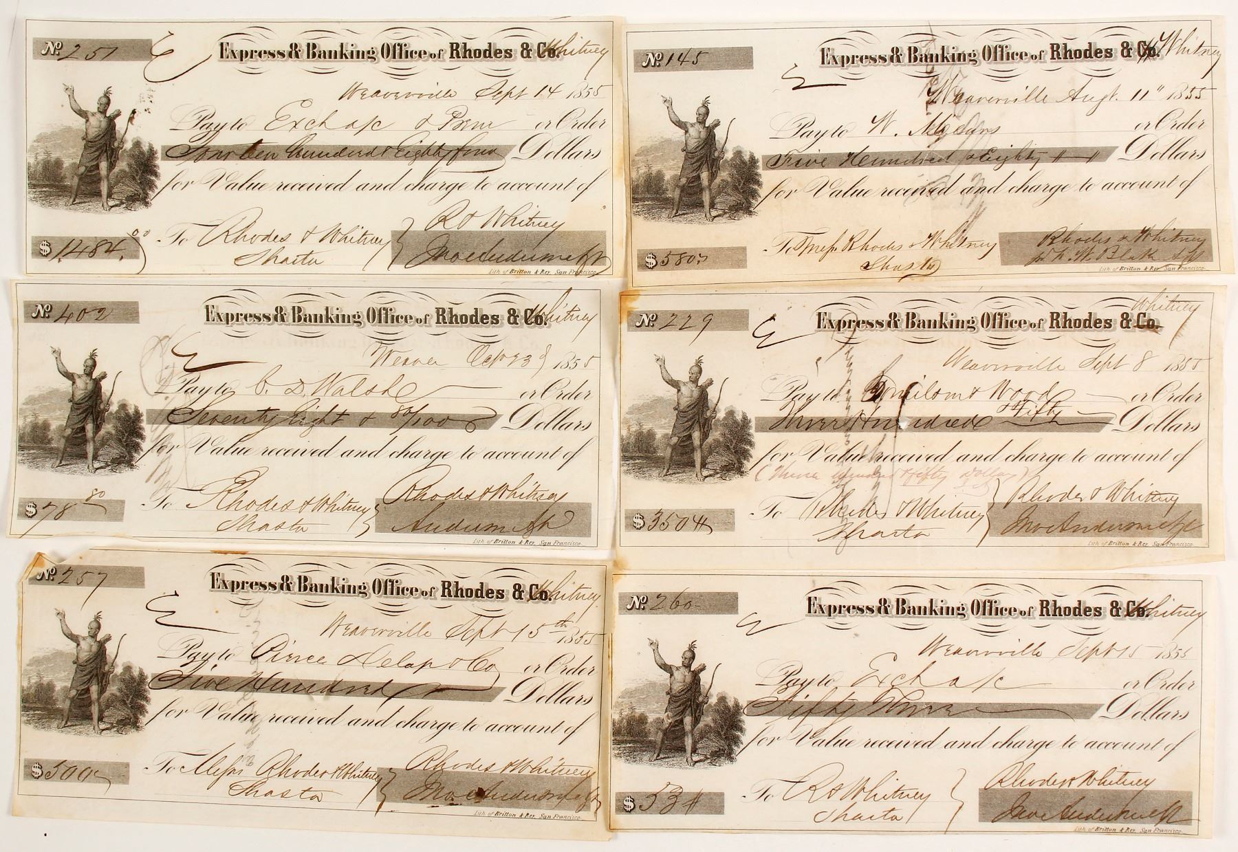 3 checks for Express & Banking Office of Rhodes & Co. 1855. 1 check signed by FW Blake. To Rhodes and Whitney, Shasta. 1 dogear, 1 has toning State: California City: Date: 1855
