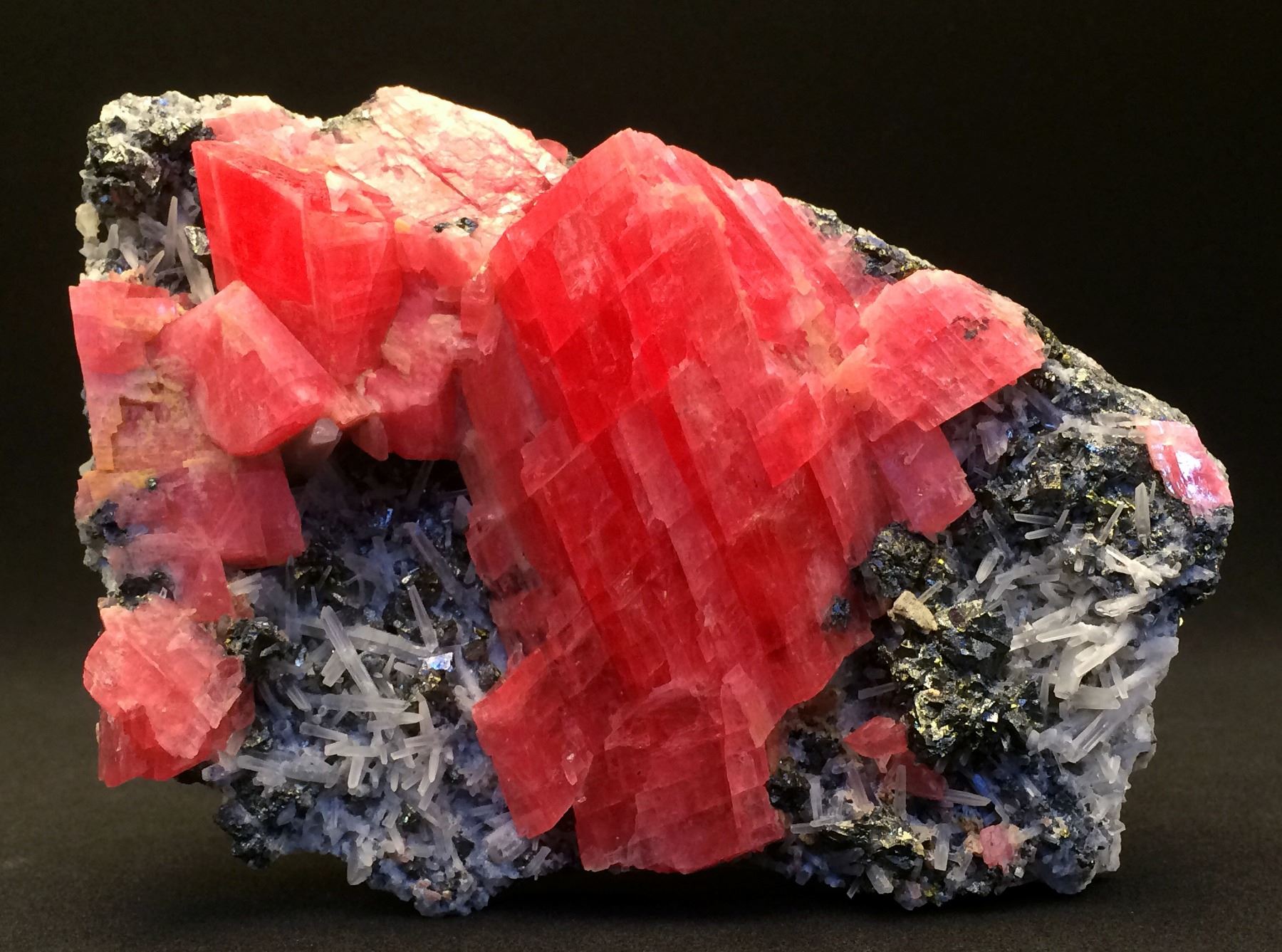 The Sweet Home Mine in Alma, Colorado is the source of world's finest crystals of rhodochrosite (manganese carbonate). Originally opened in the 1870's as a silver prospect, the underground mine was worked only sporadically and finally abandoned as a silver venture in 1966, after producing a total of $215,000 in then-current silver prices. The mine was reopened in 1991, by a mining partnership headed by Bryan K. Lees of Collector's Edge Minerals, Inc. to mine solely for the collectible mineral species rhodochrosite. After a rough start, the mineral specimen mining venture turned out to be wildly successful with many superb rhodochrosite specimens being harvested and placed into the top public and private mineral collections in the world. This specimen was found in 2004, the last year of operations, at the Sweet Home Mine. The specimen features several large, cherry-red rhodocrosite crystals and sections of incomplete rhodochrosite crystals on a matrix of needle-like quartz crystals with several metallic sulfide minerals also present. A very colorful specimen. Dimensions (cm): 9.5 H x 12.7 W x 3.8 D. Location: 04-09 Pocket, Watercourse Raise, Sweet Home Mine, Mount Bross, Alma District, Park Co., Colorado, USA City: Alma State: Colorado Date: