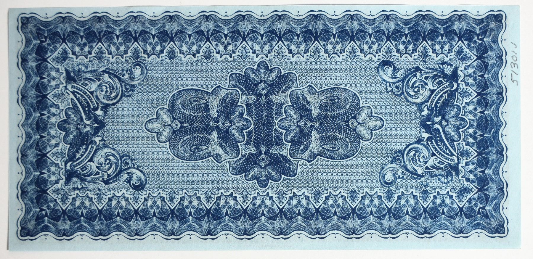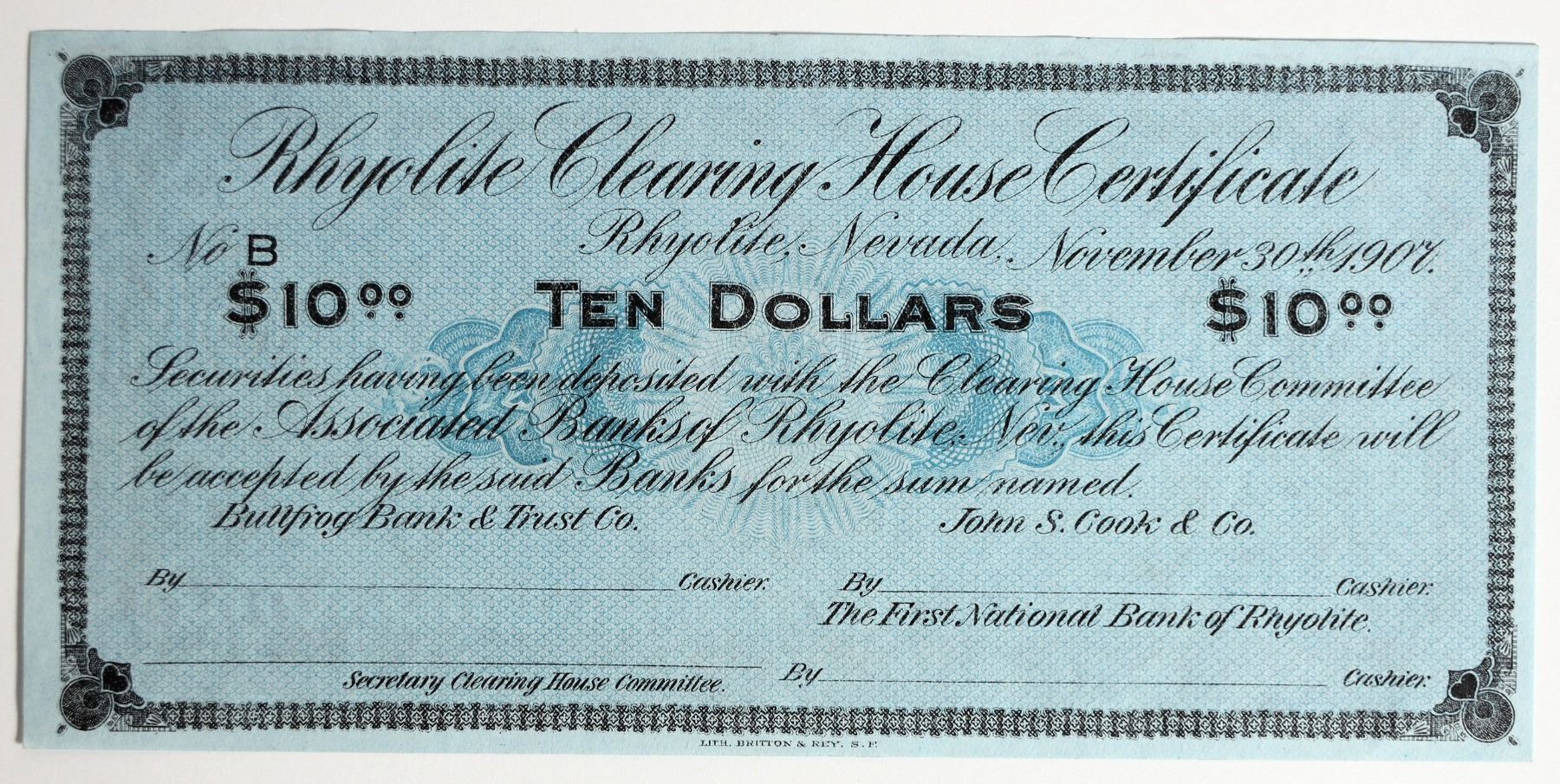 These 1907 Depression notes were printed when banks thought that the looming panic would have people hoarding money, leaving almost none circulation. The panic did occur, but Clearing House Certificates weren't needed in Nevada. Lithography by Britton & Rey of San Francisco. Unissued $10 note; black ink on blue background. 7 x 3 1/2 inches.