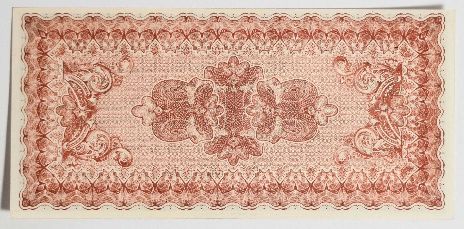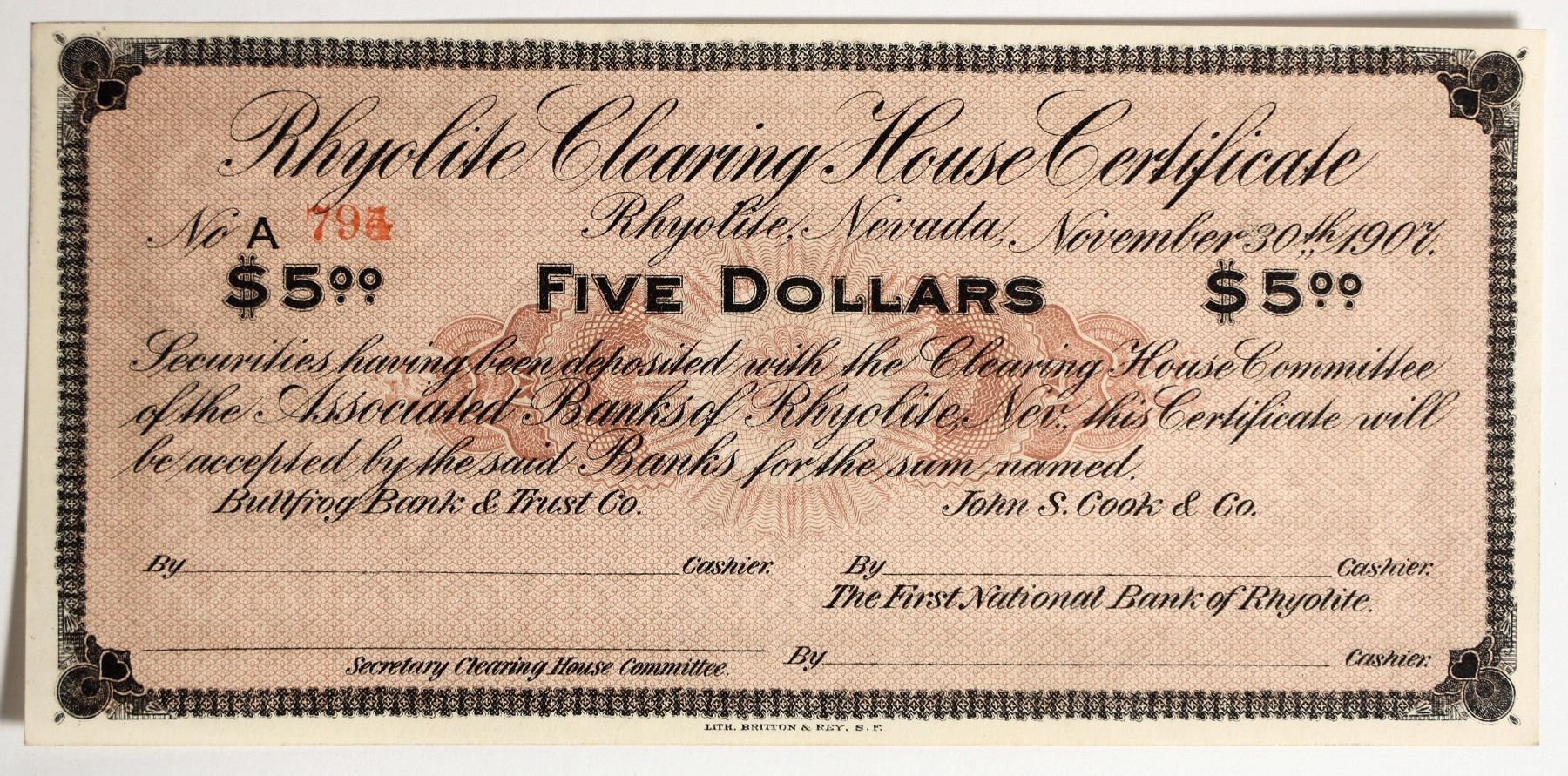 These 1907 Depression notes were printed when banks thought that the looming panic would have people hoarding money, leaving almost none circulation. The panic did occur, but Clearing House Certificates weren't needed in Nevada. Lithography by Britton & Rey of San Francisco. Unissued five dollar note.