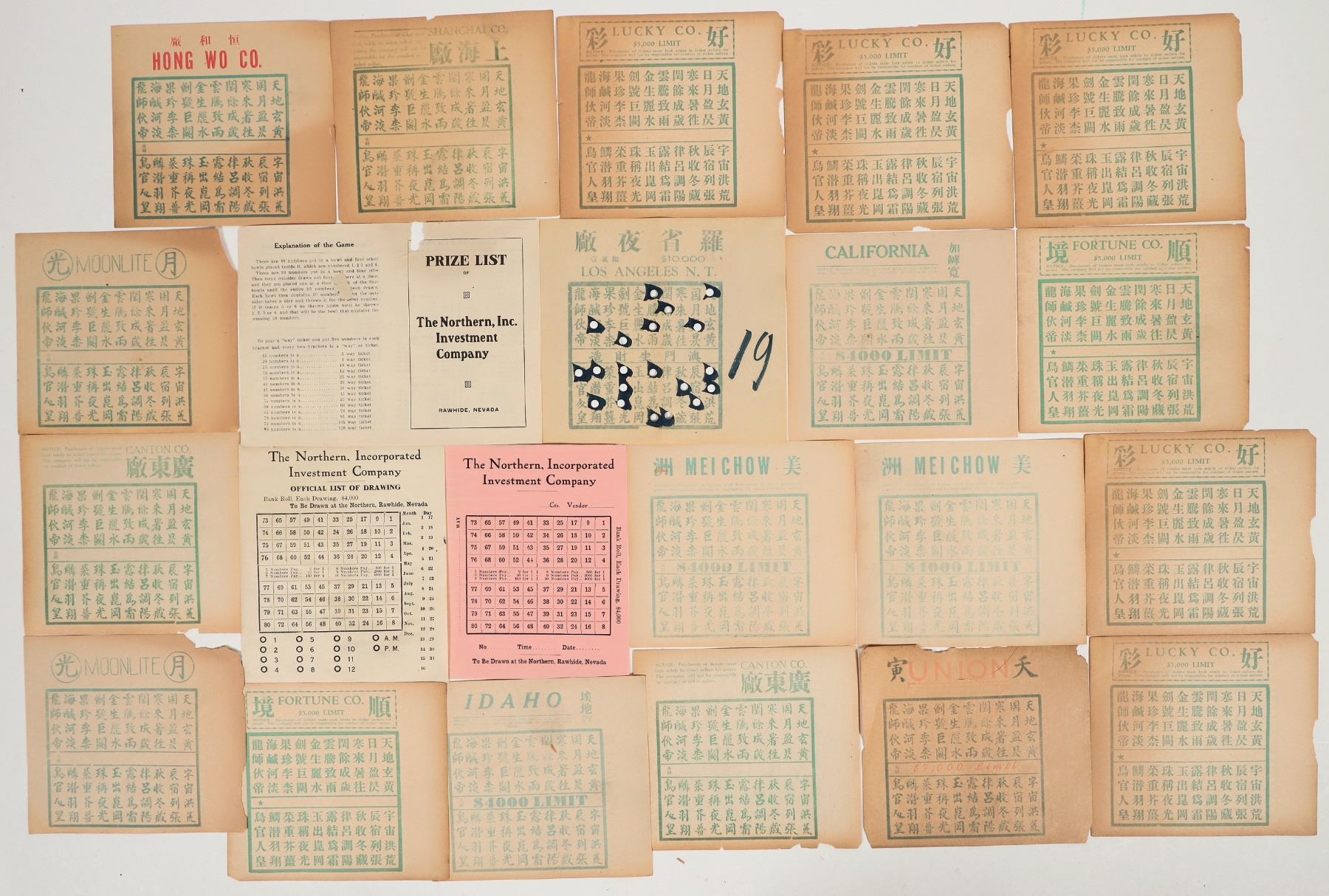 Lot of approx. 20. Includes three items from The Northern, Incorporated Investment Company, which was tied to the Northern Saloon in Rhyolite: two Keno game sheets and a prize list. Also in the group is a used Keno sheet from Los Angeles, as well as 15 or so unused Chinese Keno game sheets. Keno was played much differently in 1908 than today's electronic game. Eighty numbered balls were placed in a bowl. Four empty bowls, numbered one through four, were placed alongside. Then an "outsider" draws four balls at a time. These are placed one at a time in each of the four bowls until all bowls contain 20 balls. The outsider then throws a dice until a one, two, three or four comes up. That is the number of the bowl with the 20 numbers being called for the current game. After any winners have been paid, the process is repeated.