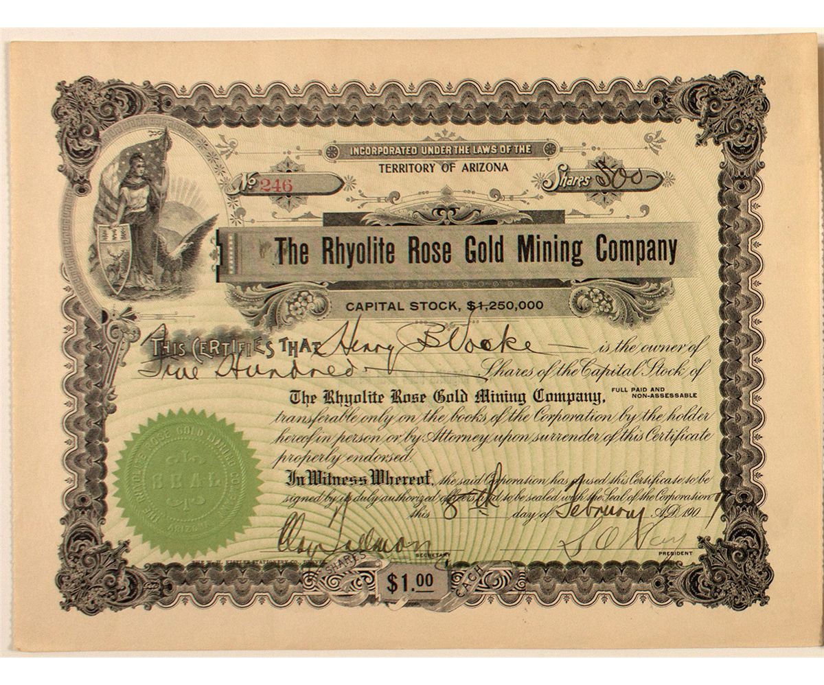 Arizona Territorial capital stock certificate. Document #246 for 500 shares, signed by the Secretary and President. Intricate black borders and scrolling, with large vignette in upper left of a flag bearing woman holding a shield and an eagle next to her.City: County: NyeState: NVDate: