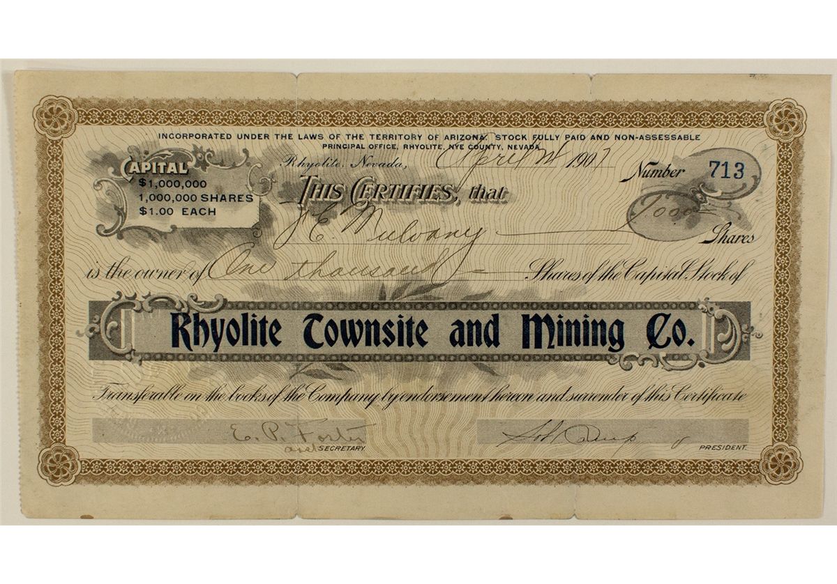 Rhyolite Townsite and Mining Co. Stock Certificate