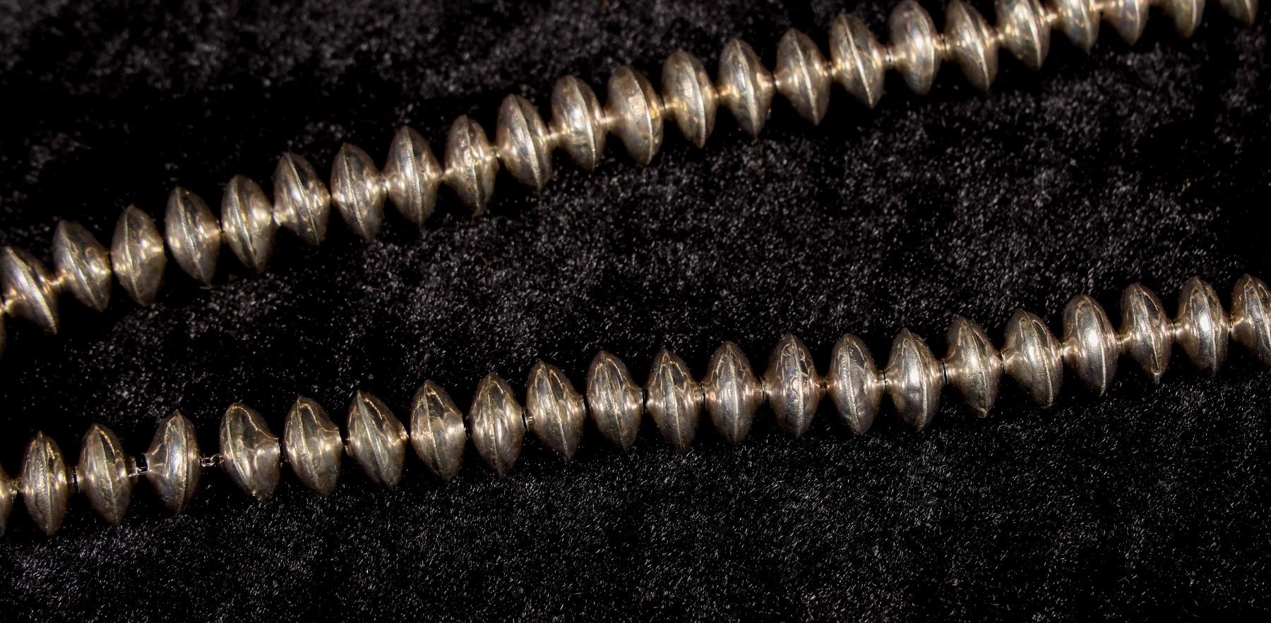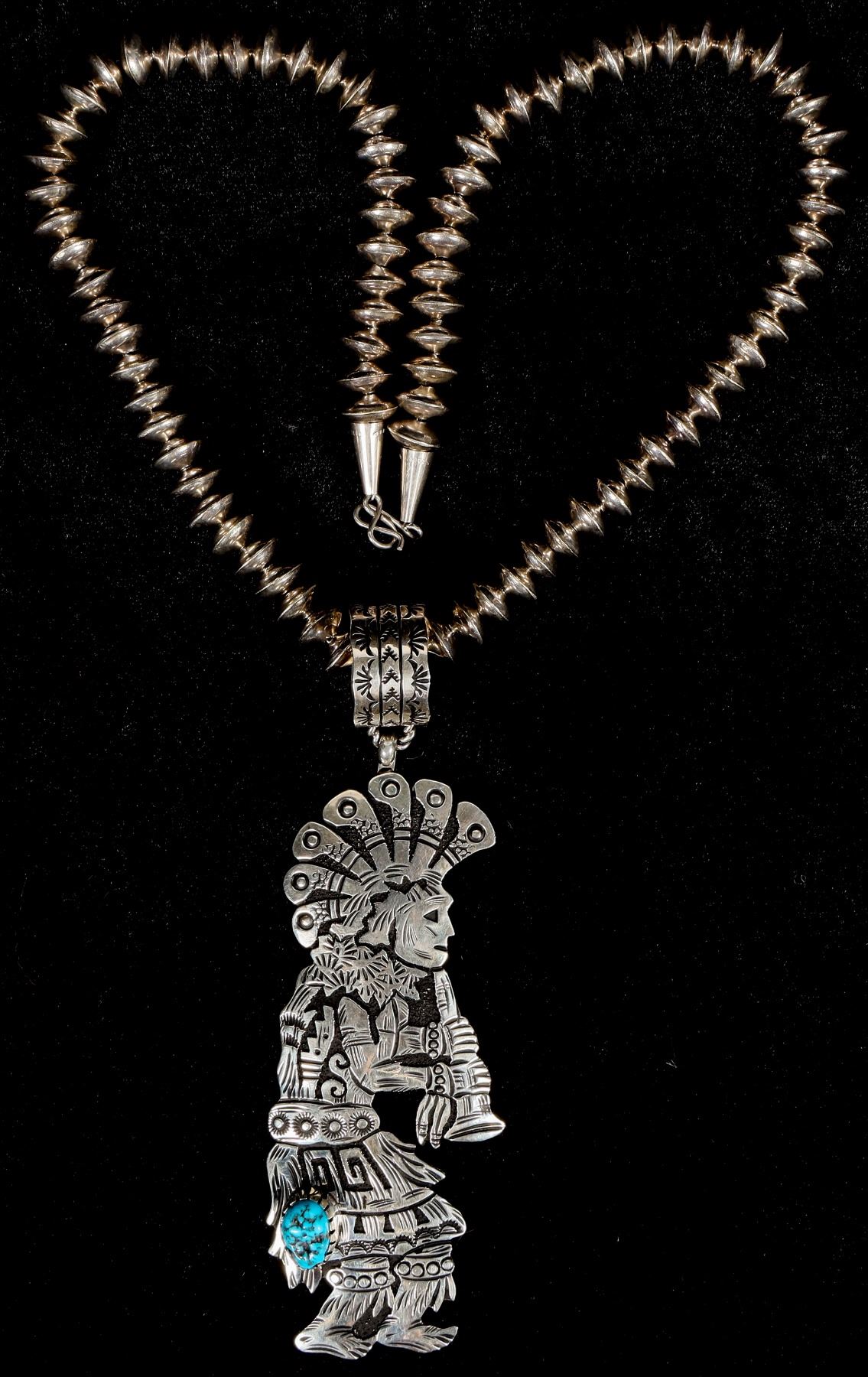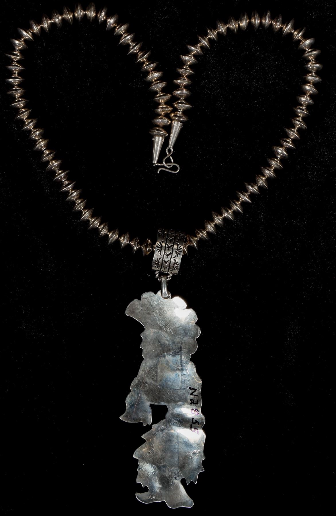 This is an outstanding piece made by Richard Singer and signed with his hallmark, the Kokopelli Kachina stands at 4" tall beautifully detailed and engraved and highlighted with a single turquoise stone, the Kokopelli is attached to a 1" engraved sterling bale and suspended from a 20" domed silver beaded necklace, these pieces by Richard are very desirable and in high demand.