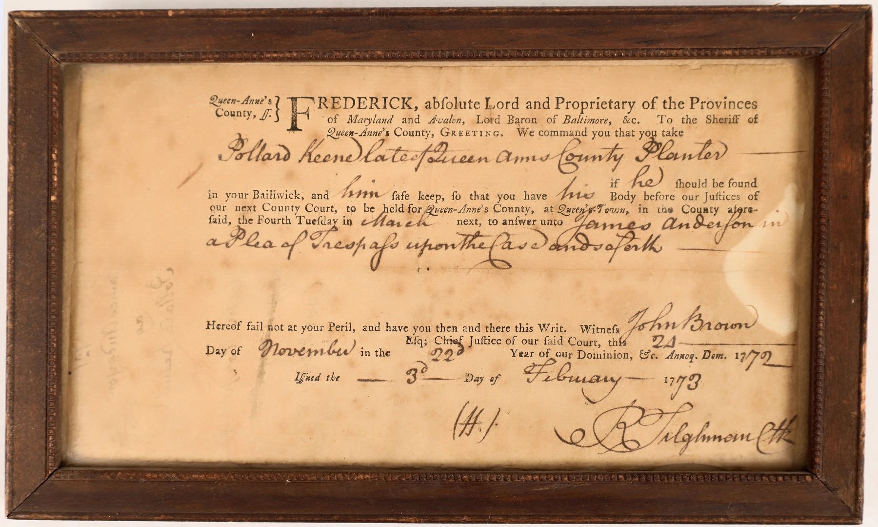 Framed, signed by Richard Tilghman, capias issued out of Queen Ann's County , Maryland, in the name of Frederick, absolute Lord and Proprietary of the Province of Maryland and Avalore, dated February 3, 1773, to produce before the County Court the body of Pollard Keene. Richard Tilghman, 1746-1786, "Richard Tilghman studied law at the Temple in London, and then obtained employment at the East India Company, with recommendation for the position of attorney general of India. However, he died at sea before he could take up this position. He is likely to be the Mr. Richard Tilghman mentioned in the shipboard diary of the Fox returning to England from Calcutta 1780-81. Richard Tilghman's will, written and signed 15 January 1785, prior to a journey [back to] the East Indies names as legatees of money and/or land in Pennsylvania: his father James, eldest brother Tench, brother Philomon, his natural daughter Elizabeth and friend Mrs. Ann Walton." from wikitree.com. The Tilghman family was prominent in Maryland politics . Frame 5.25x8.5". From the Hyatt Estate. Maryland 1773