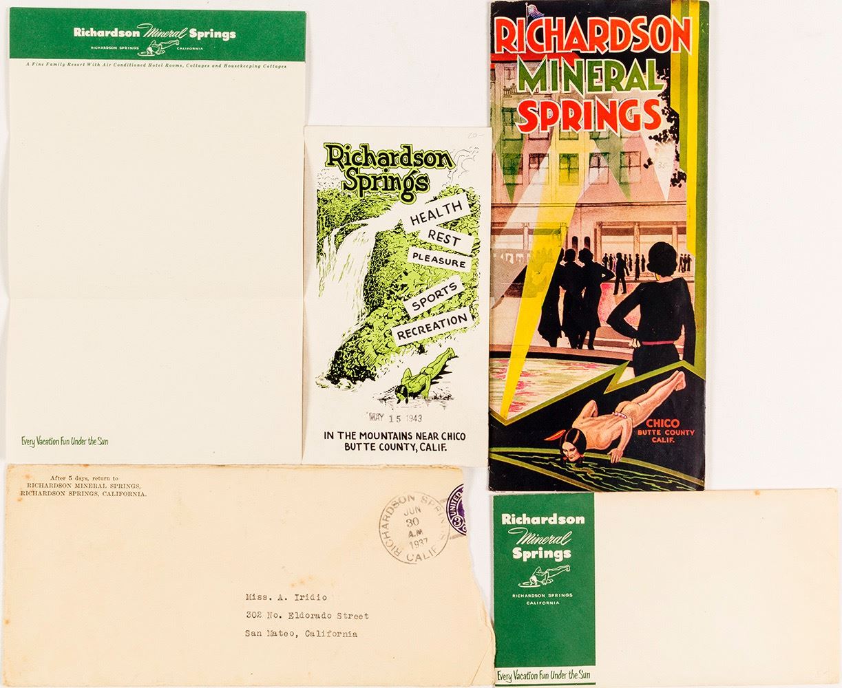 Located in mountains near Chico in Butte County. Fold out pamphlet from 1943 with map on rear, 6.25" x 13.75". Mostly intact cover from Richardson Mineral Springs, 1937 Color foldout brochure with health benefits, room rates and area photos. Interesting Art Deco style cover. 9" x 4" folded. 5 folded into thirds letterhead and 3.5" x 6.5" green and white envelope from Richardson Mineral Springs. Date: Location: Butte County, California HWAC # 53605