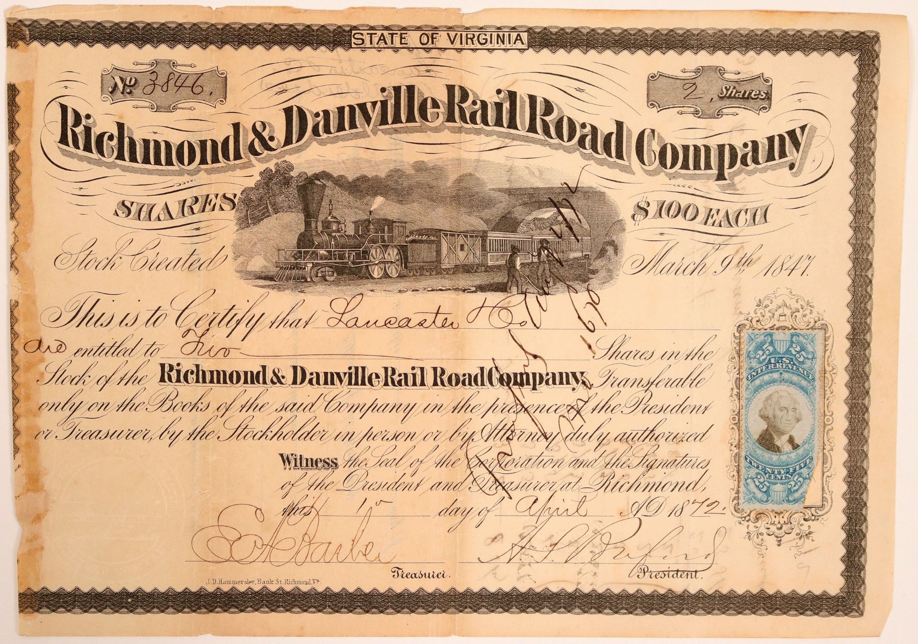 Was a railroad that operated independently from 1847 until 1894, first in the U.S. state of Virginia and later on 3,300 miles of track in nine states. #3846, I/C, 2 shares @ $100 par issued April 15, 1872 signed by president not legible. Black, embossed seal, vignette train under bridge, 25c revenue stamp lower right. J. D. Hammersley printer.
